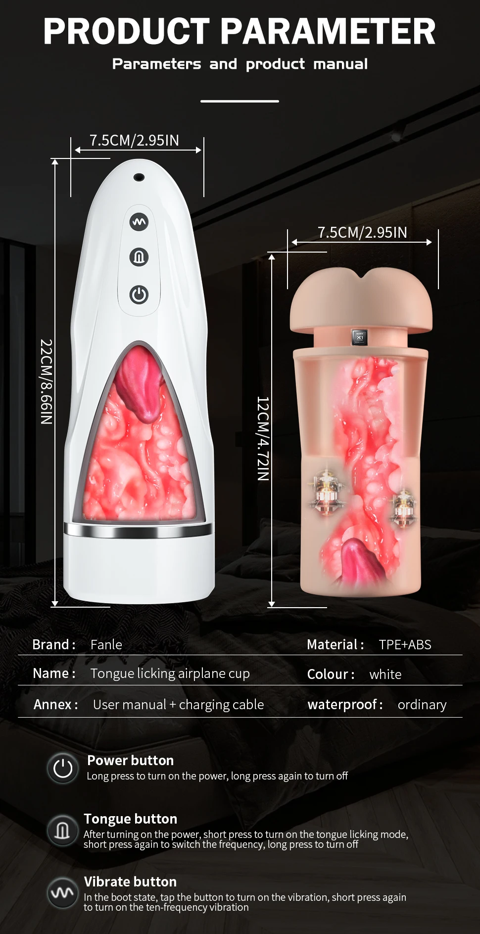 √Новое обновлениеМужская мастурбация Fanle имеет реалистичные функции влагалища и языка. Эта мужская чашка мастурбатор, которая сочетает в себе оральный секс с вагиной, является моделью, которая имитирует текстуру человеческого влагалища. Силикон внутри выглядит как настоящая женщина. Он имеет 10 режимов вибрации и 10 режимов вылизывания языка. При включении режима сосания маленький язык может слизать до 690 раз в минуту. Реалистичное прикосновение языка удерживает ваш член, что делает вас не в состоянии остановить.