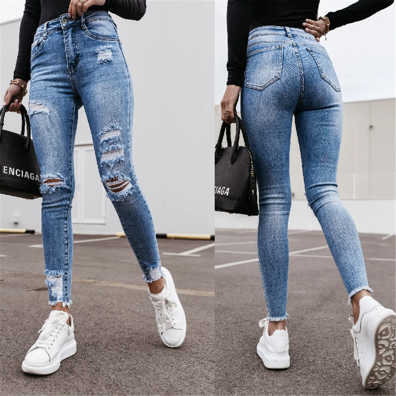 Женские рваные облегающие джинсы с высокой талией и карманами
