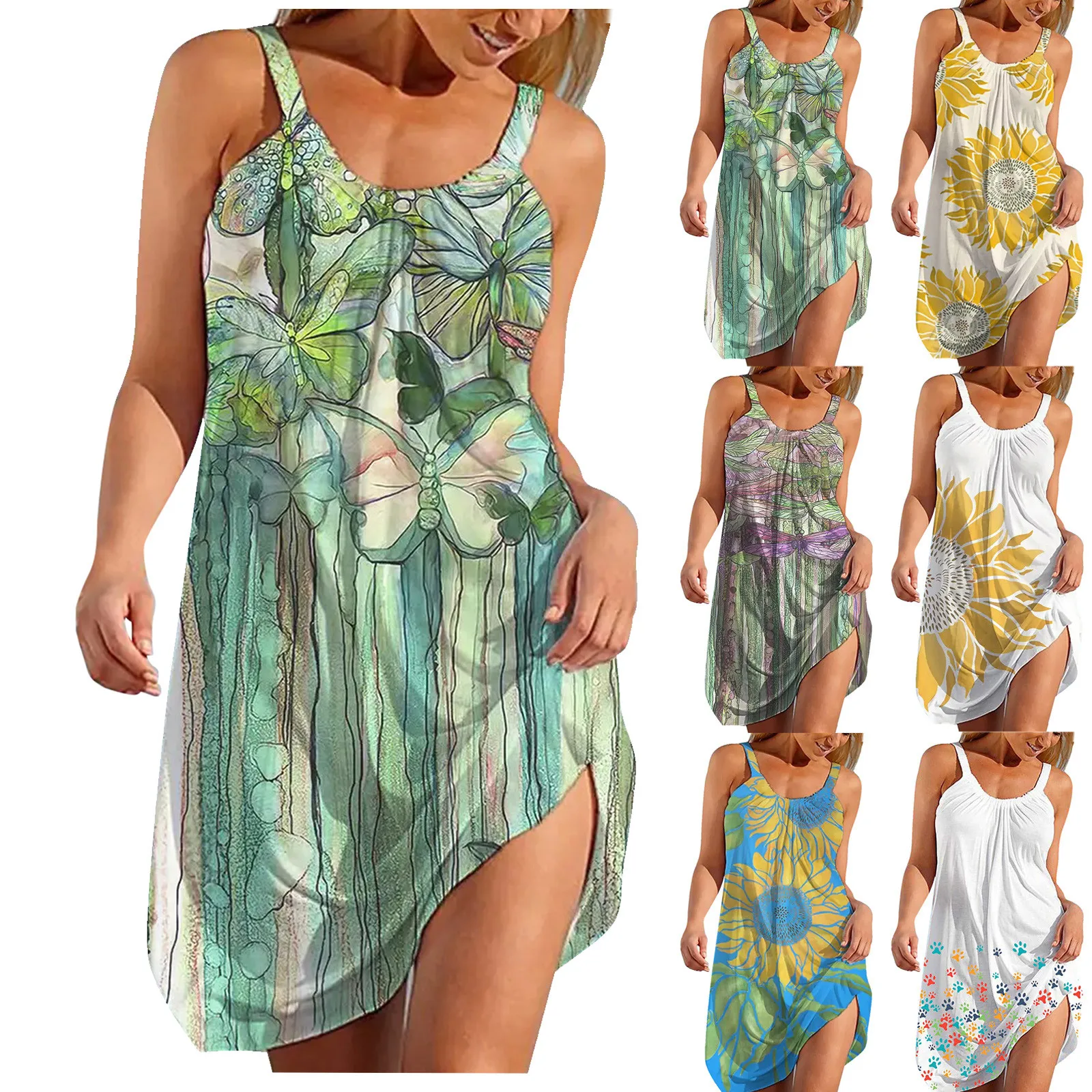 Женское модное сексуальное Пляжное Платье До Колена без рукавов с принтом на подоле