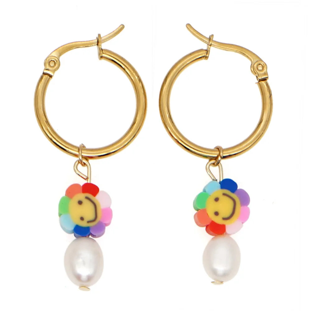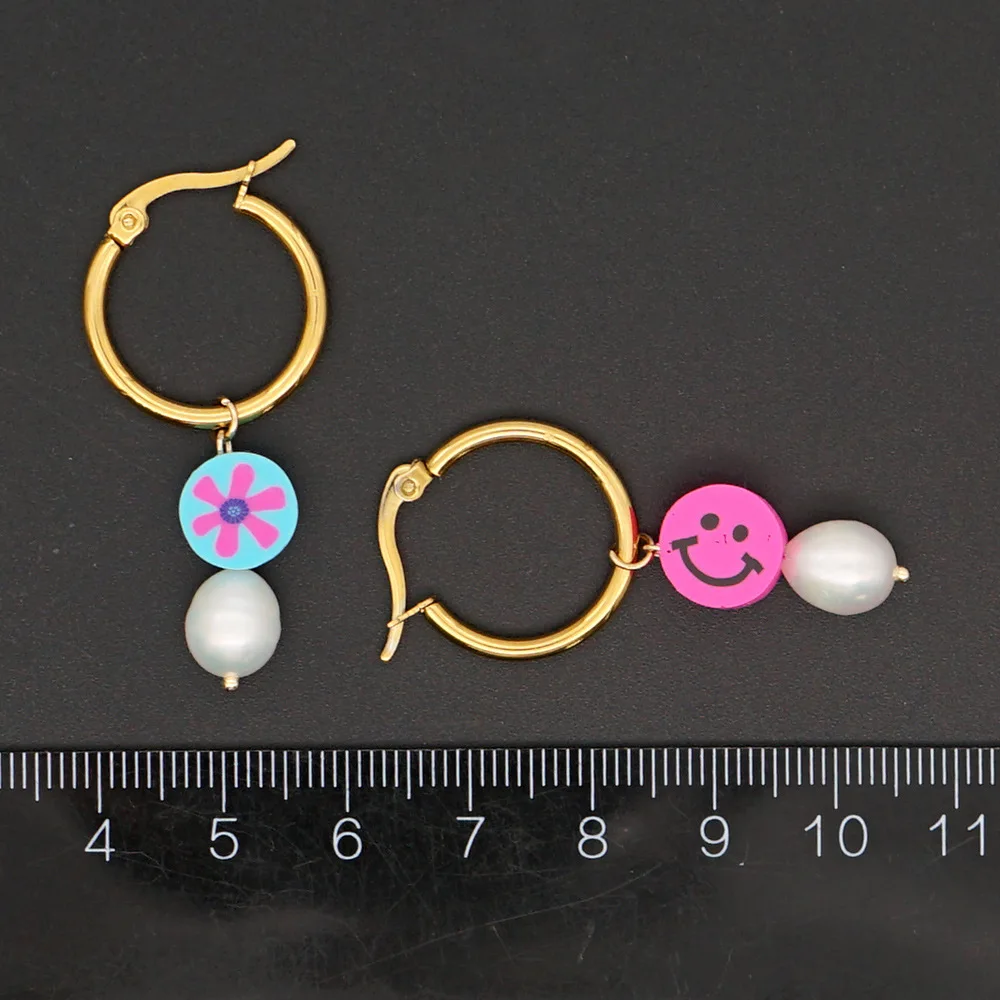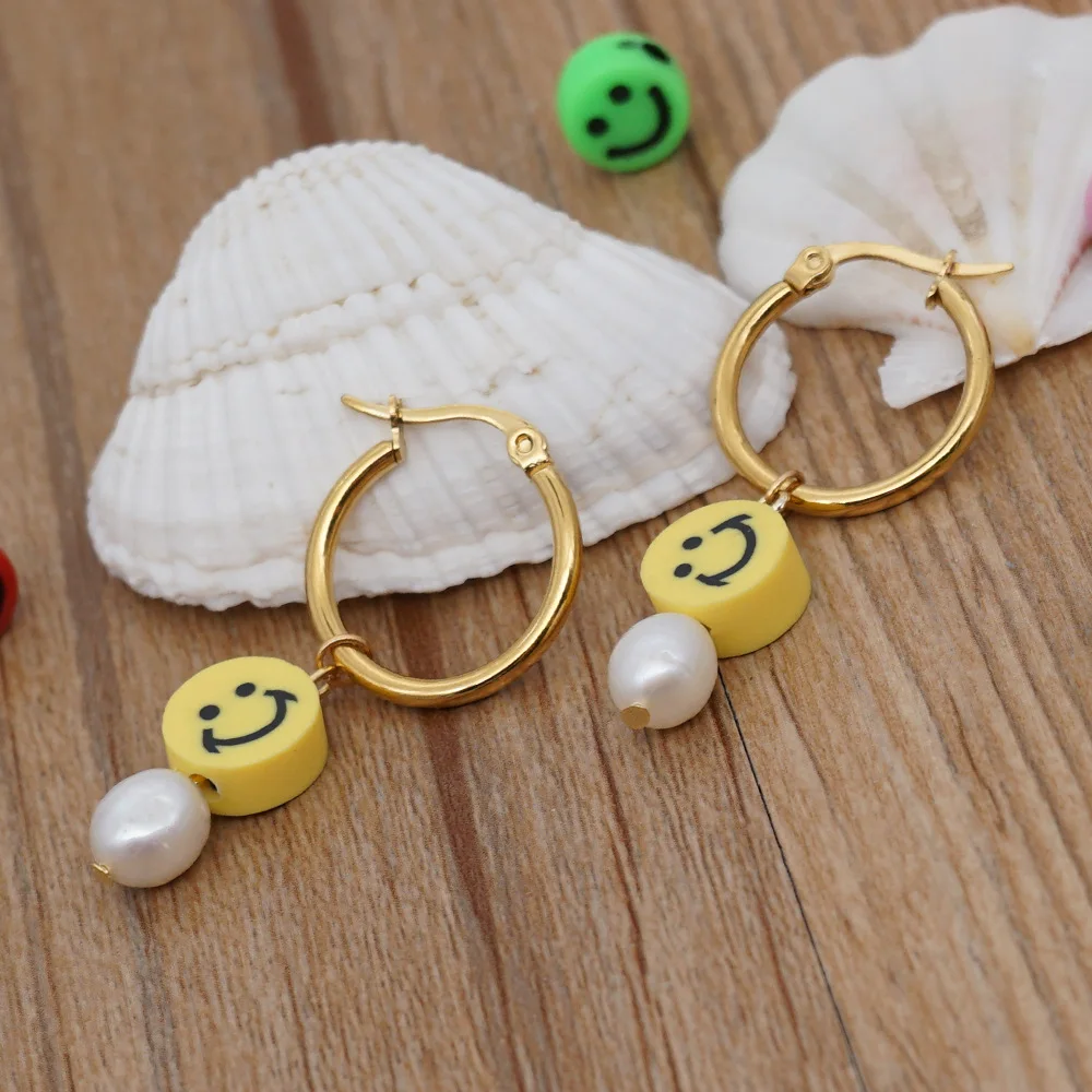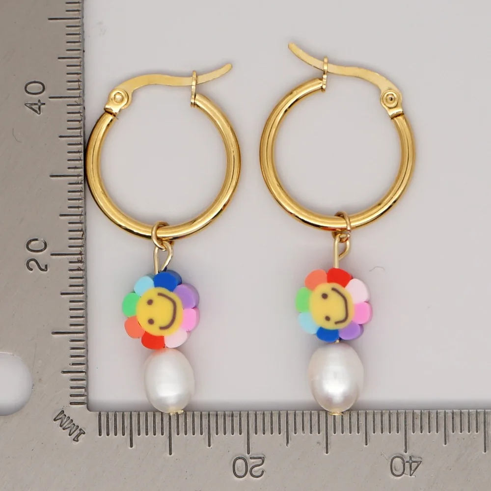 Модные милые цветные серьги-кольца BLIN с улыбкой, цветком, натуральным жемчугом и бусинами, висячие серьги-кольца, летние серьги из нержавеющей стали