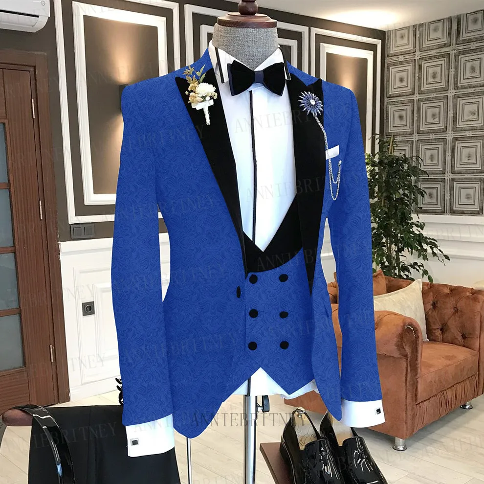 2021 формальный костюм для мужчин 3 предмета в комплекте из жаккардовой ткани королевский синий пиджак на заказ Модный свадебный костюм со смокингом, лацкан с тупым углом; Блейзер, жилет, брюки