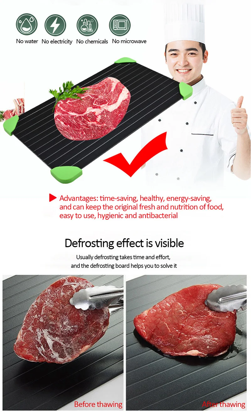 Экологичность: пластина может быть повторно использована, пригодна для повторного использования и экологична. До тех пор, пока мы не используем его как разделочную доску или используем острый материал для очистки пластины, что может привести к повреждению пластины или повлиять на эффект размораживания.