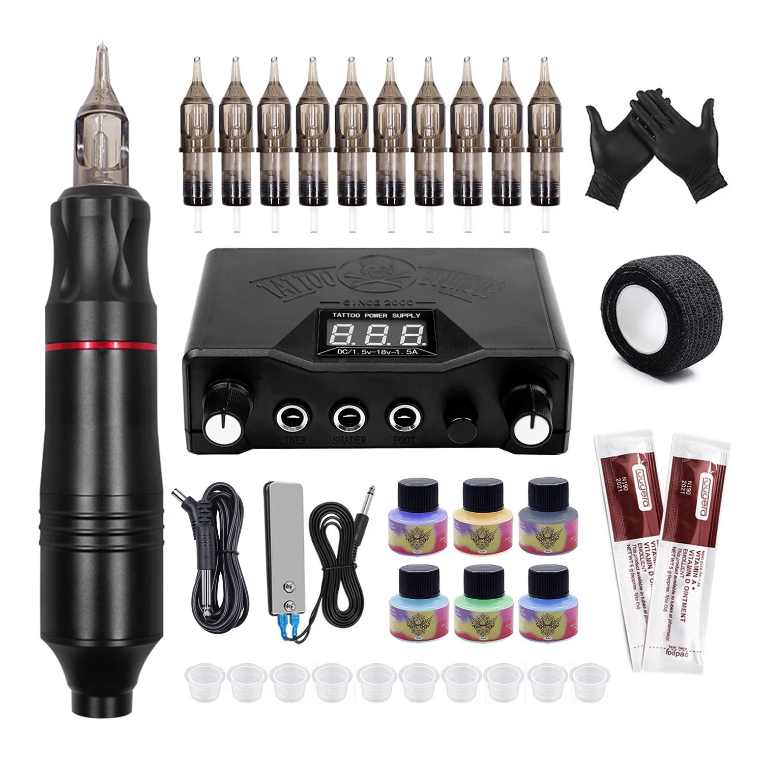 Источник питания: только 1 шт. источник питания для татуКомплект 1:2 шт. ручка для татуировки1 шт. источник питания для татуировки1 шт. педаль2 шт. соединительная линия2 пары перчаток1 шт. бандажная лента10 шт Витаминная мазь12 шт 5 мл тату чернила20 шт иглы татуировки50 шт чернильный стаканчик1 шт. коробкаКомплект 2/3:Комплект 1:1 шт. ручка для татуировки1 шт. источник питания для татуировки1 шт. педаль1 шт. соединительная линия1 пара перчаток1 шт. бандажная лента2 шт Витаминная мазь6 шт 5 мл тату чернила10 шт иглы татуировки10 шт чернильный стаканчик1 шт. коробкаСовет: чернила для тату только для практики, 5 мл/бутылка. Желтый, синий, фиолетовый, черный, белый и зеленый