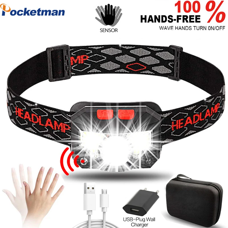 Мощный светодиодный налобный фонарь с датчиком, Головной фонарь с зарядкой от USB, водонепроницаемый, для кемпинга, походов, работы, осветительные инструменты