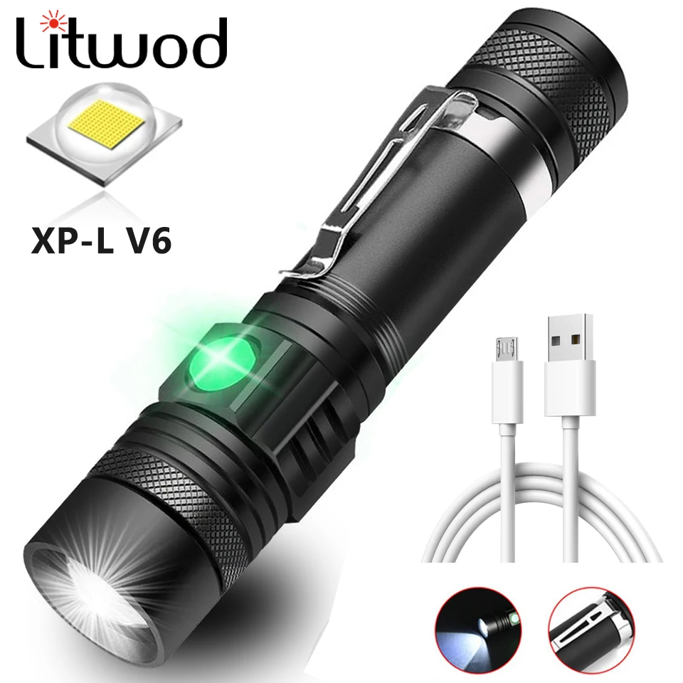 Светодиодный фонарик с зарядкой по USB, ультра яркий, с светодиодной лампой XP-L V6, водонепроницаемый фонарик, масштабируемый, 4 режима, многофункциональный фонарь