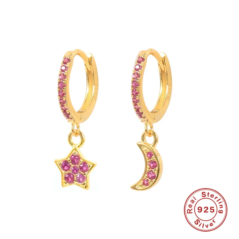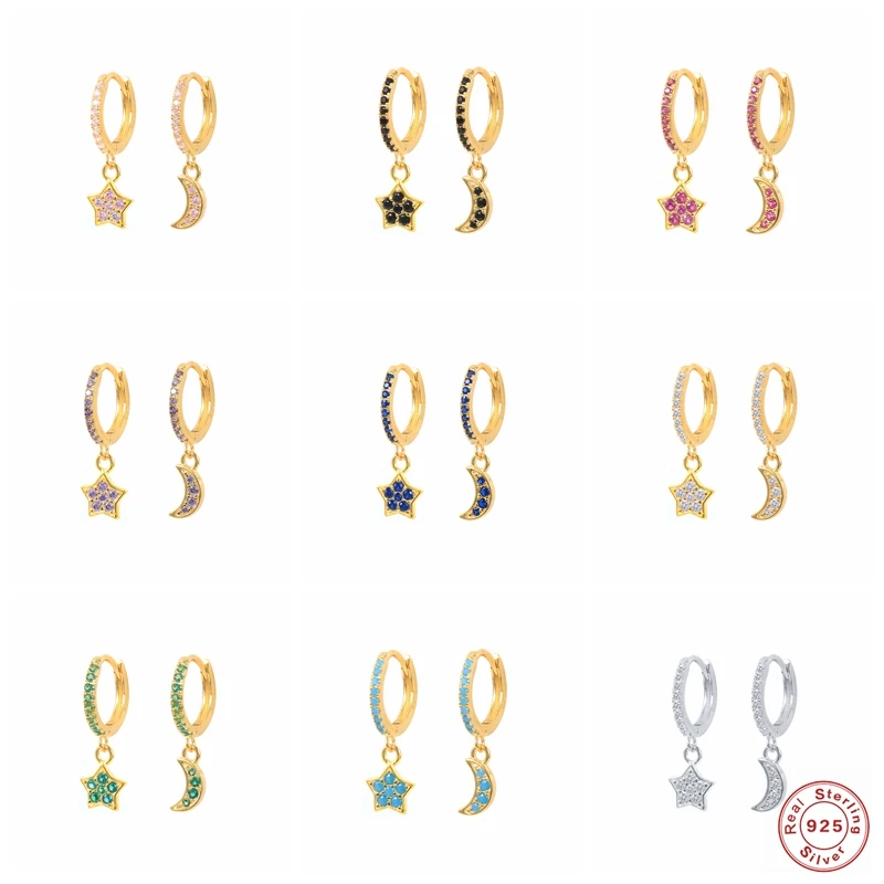 Серьги Huggie из стерлингового серебра 925 пробы, серьги-кольца с цветным цирконием в виде Луны и звезды для женщин, фиолетовыезеленые кристаллы, orecchini donna