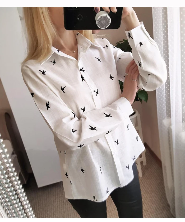 Свободные рубашки с принтом птиц, женские блузки и топы из хлопка и...