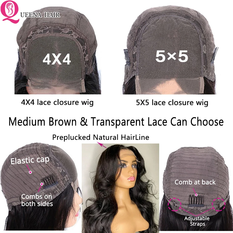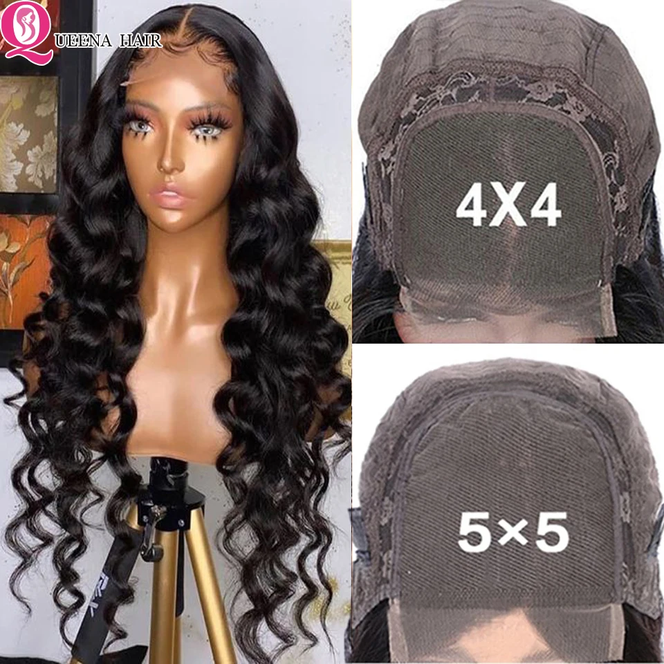 Парик с объемными волнами 4x4 5x5 HD, парик с застежкой на сетке, предварительно выщипанные свободные волнистые волосы на сетке, парики из человеческих волос для женщин, бразильские волосы Queena