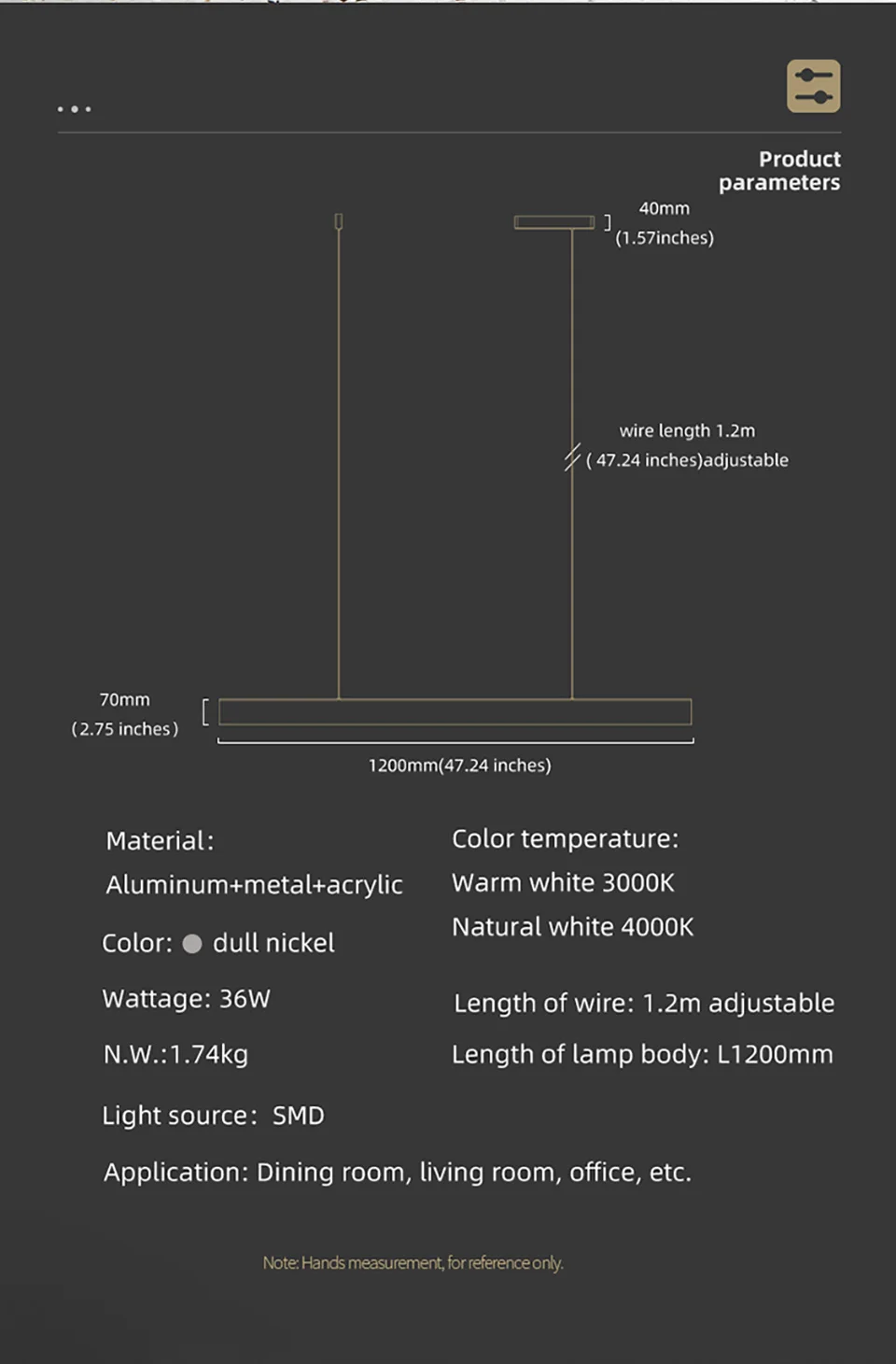Материал: алюминий + металл + акрилЦветовая температура: теплый белый 3000K/натуральный белый 4000KЦвет: тусклый никельДлина провода: 1,2 м регулируемыйМощность: 36 ВтДлина корпуса лампы: l1200ммВес нетто: 1,74 кгПрименение: столовая, гостиная, офис и т. Д.Светильник Источник: SMDПримечание: Измерение рук, только для справки.