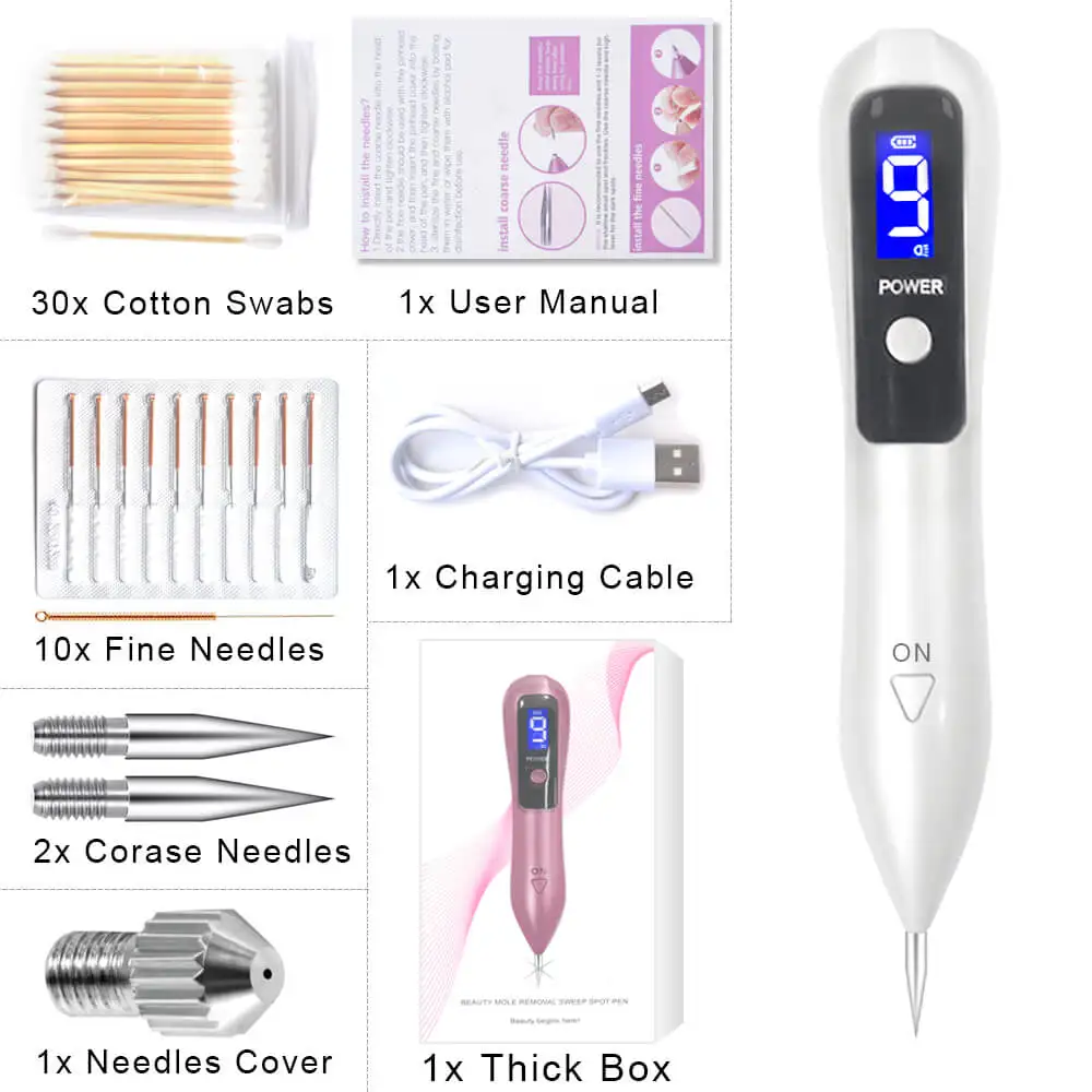 Посылка включает: 1 х прибор для удаления родинок Ручка 30 x ватные тампоны 10 x тонкой иглы 2 x грубой иглы: 1 шт. CD-диск-1 x зарядка через USB кабель (1 шт.); Руководство пользователя (1 шт.) посылка коробка> светодиодный прожектор> 9 регулируемые уровни> с ЖК-дисплеем