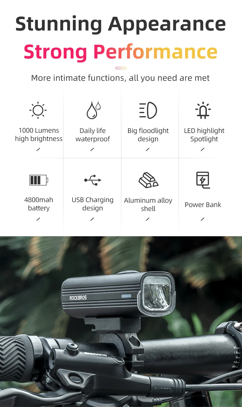 Фара велосипедная ROCKBROS, 4800 мА ч, 1000 лм, USB, заряжаемая, водонепроницаемая