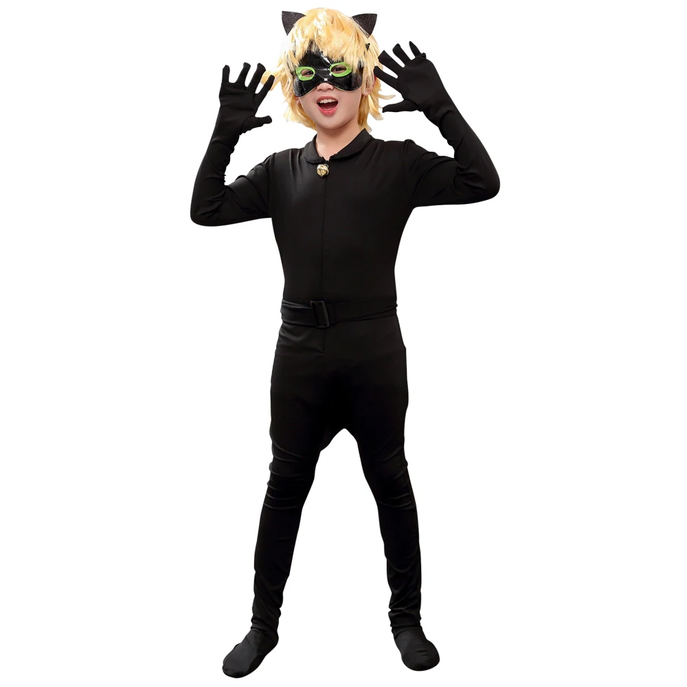 Костюм для косплея для мальчиков и девочек, комбинезон из спандекса, Карнавальная вечеринка, костюм с черной кошкой, парик, маска, игрушка, Хэллоуин