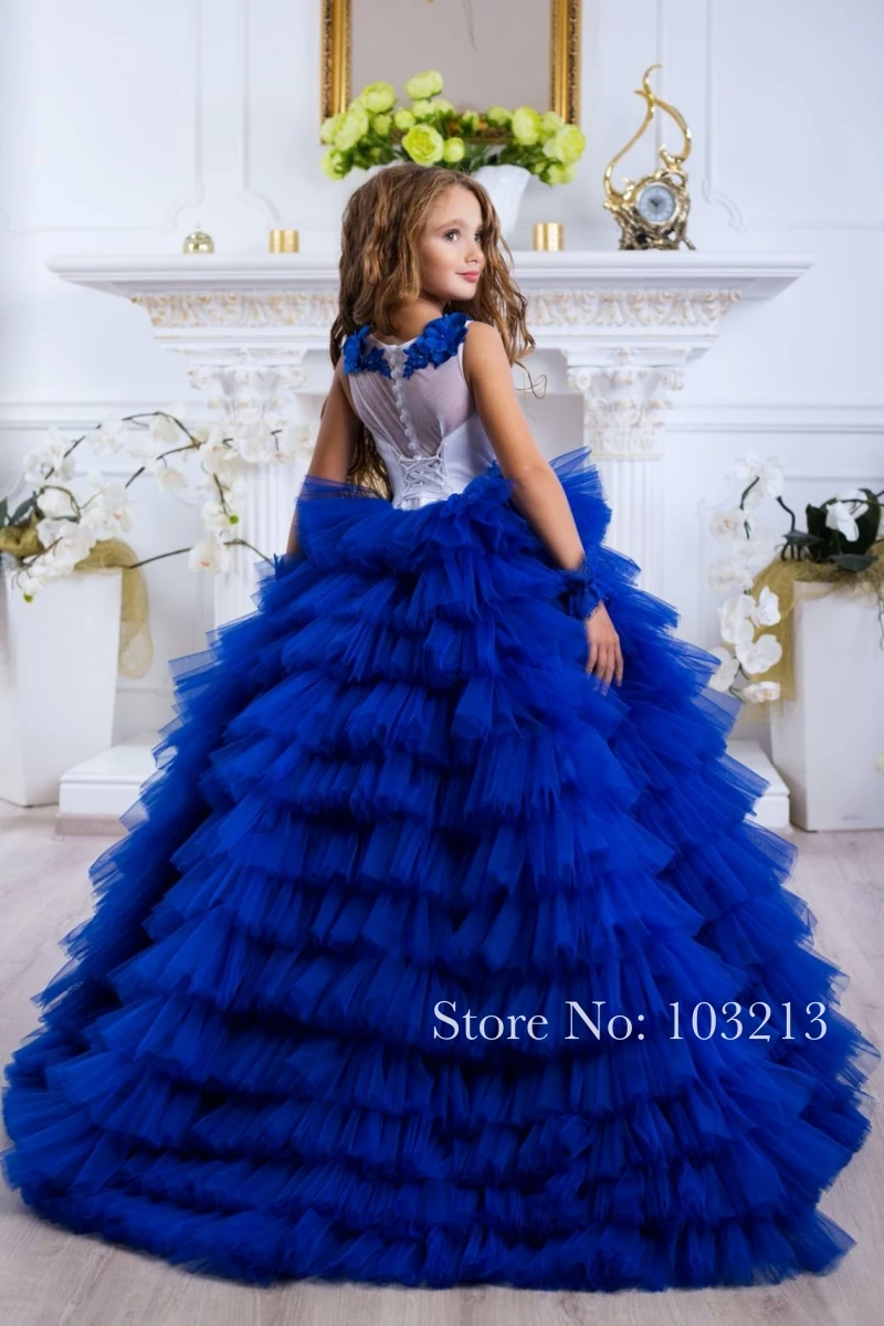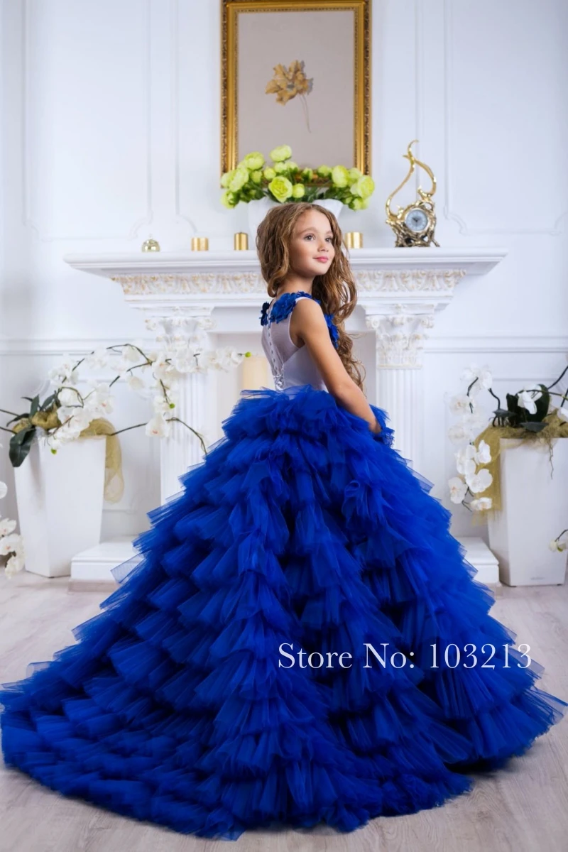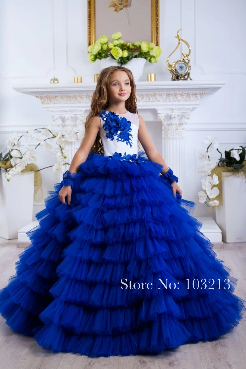 Королевское синее платье без рукавов для девочек в цветочек платья с овальным вырезом с гофрированными манжетами бальное платье в винтажном стиле; Нарядные платья для девочек для свадебного торжества