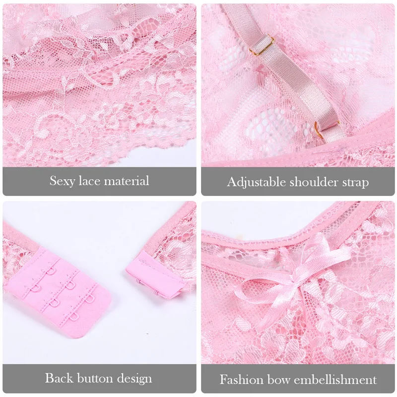Характеристики: сексуальный бюстгальтер без стальных колец, комплект кружевного тонкого нижнего белья с чашечками, красивый дизайн.Материал: полиэстер, удобный.Цвет: белый, розовый, красный, синий, черныйПовод: идеально подходит для путешествий, свиданий, вечерние, уличныеПосылка включает в себя: комплект с бюстгальтером