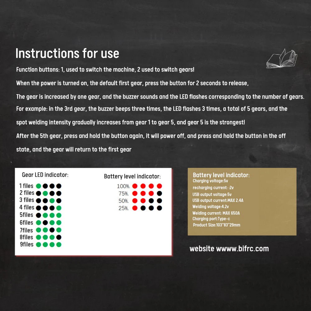 Наименование: точечный сварщикМатериал: металлический корпусЕмкость аккумулятора: 5500 мАчСварочный ток на выходе: 4,2 в максимальный 650aВыход USB: максимум 5 в 2,4 АПорт загрузки: Тип CИнструкции по использованию:* Пожалуйста, полностью зарядите аккумулятор перед использованием *1. Чтобы включить/выключить, нажмите и удерживайте кнопку в течение 3 секунд, а затем отпустите кнопку, когда услышите звук запуска включения/выключения.2. Нажмите клавишу быстрого доступа. Если колокол колеблется, это изменение положения. Нажмите один раз, вы можете увеличить на 1 уровень. 1-9 циклов, 9 передач является самой сильной сварочной силой.3. Сварочные работы-начиная с Уровень 1 космическая дорога, после того, как товар будет обнаружено, устройство начнет сварки после 0,5 секунд. Регулировка энергии может быть скорректирована для различных сварочных операций. Если высокий уровень входит в режим защиты тока и перезапускается, вы можете подключить usb-вход; В противном случае вы можете подключить usb-вход.4. Автоматическое выключение После-15 минут бездействия, устройство автоматически отключится.5. Выход USB-после подключения, выход USB будет автоматически активирован. Поскольку выходной ток меньше 50 мА · ч, устройство автоматически отключает выходную мощность. Нажмите короткую кнопку, чтобы восстановить выходную мощность.6. Предупреждение об ошибке-если устройство не работает, звуковой сигнал будет по-прежнему звучать после его включения;7. Обновление прошивки-Сохраните порт обновления, вы можете обновить его до последней прошивкиУпаковочный лист:1 * аппарат для точечной сварки2 * точечная сварочная ручка1 * никелевый лист (2 м)1 * TYPE-C кабель
