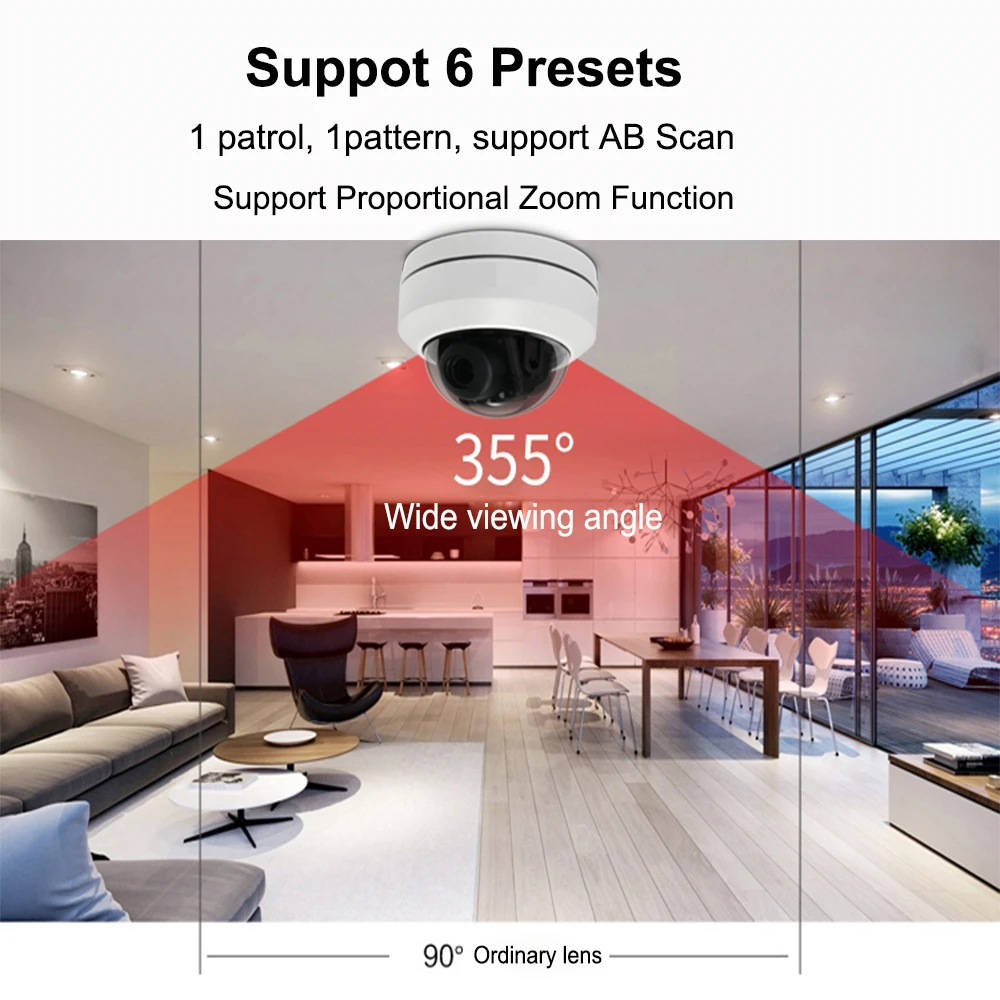 Панорама: 355 ° непрерывное вращение; Наклон: 0 ° ~ 25 ° автоматический Флип