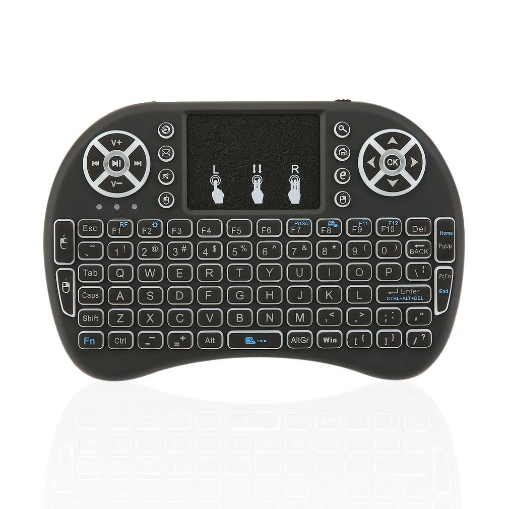Особенности:1. Изделие с 3 цветами подсветки (красный, синий, зеленый)2,92 клавишная клавиатура мультимедийные клавиши управления и клавиши управления ПК3. Высокопродвинутая беспроводная технология RF 2,4G, обеспечивающая защиту от помех и надежное соединение, радиус: 10 метров4. Полнофункциональная мини-клавиатура.5. Эргономичный ручной дизайн прост в переноске и эксплуатацииОписание:1. Сверхчувствительный тачпад с регулируемой функцией DPI2. Встроенная перезаряжаемая полимерная литий-ионная батарея.3. Автоматический Режим сна/пробуждения4. Используется для ПК, ноутбуков, Smart TV, для Android TV BOX и т. Д.Спецификация:Материал: пластикЦвет: черный, белый (по желанию)Размер: 146,8*97,5*19 ммРабочий диапазон: до 10 метровМощность передачи: + 5 дБ Макс.Управление напряжение: 3,3 VРабочий ток: <50 мАТок зарядки: <300 мАТок сна: <1 мАДиапазон частот: 2,4 ГГцТип батареи: встроенный литий-ионный аккумулятор, 1020mAh, 3,7 V, 3.8WhПосылка включает в себя:1 x беспроводная клавиатура1 беспроводной usb-приемник1 х USB кабель для зарядки1 х литиевая батарея1 x Руководство пользователя
