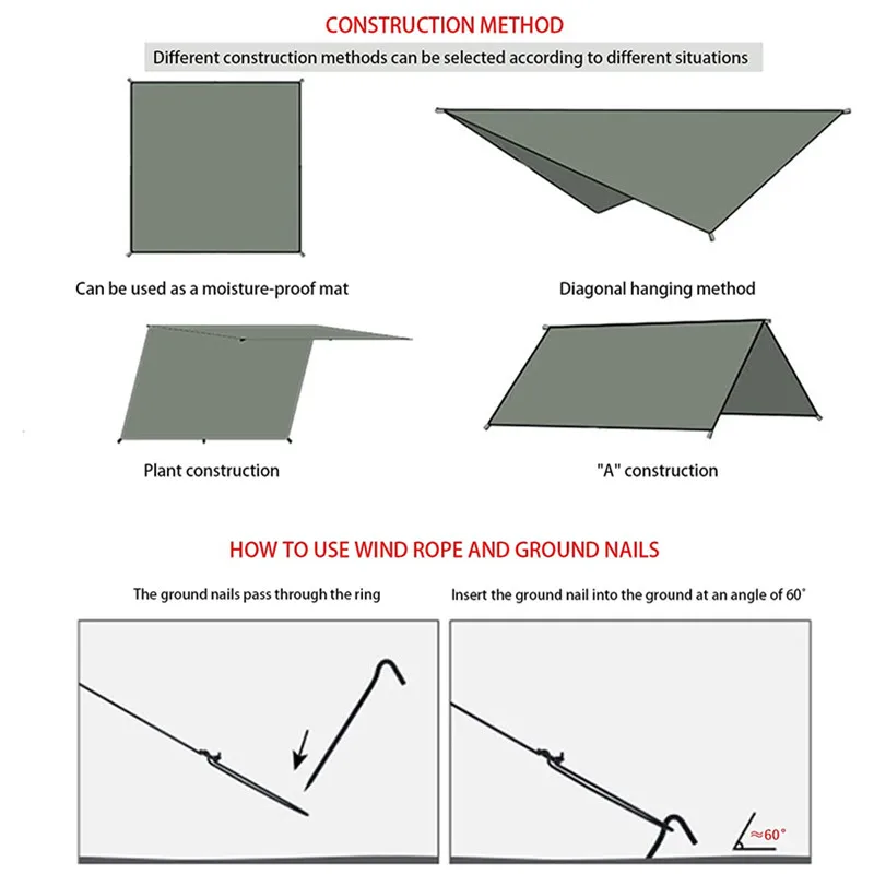 Многоцелевой тент: тент для кемпинга может использоваться в качестве гамака для дождливой мухи, палатки, навеса от солнца, тента для дождя, одеяла для пикника, пляжного одеяла, влагостойкой прокладки, теневой брезент для пляжа и парка, крышка палатки и т. Д. Чтобы защитить вас от ветра и дождя, Это обязательный вариант для активного отдыха.