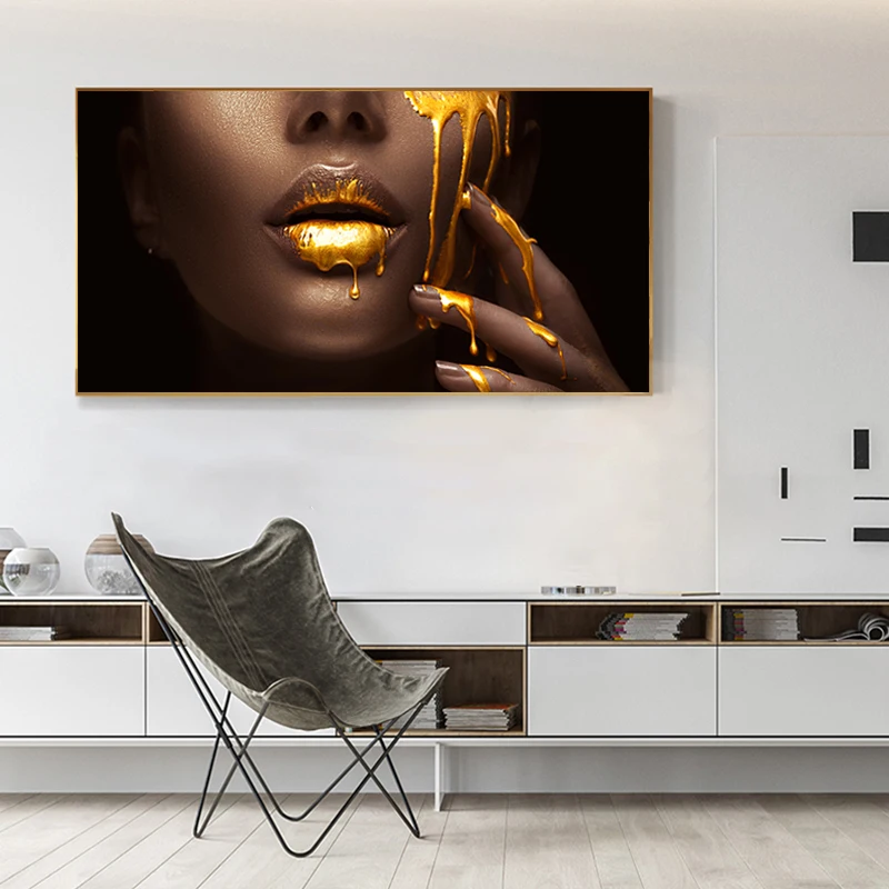 Абстрактное женское лицо с золотыми жидкими изображениями, холст, живопись, плакаты и принты для современной гостиной, настенное художественное украшение