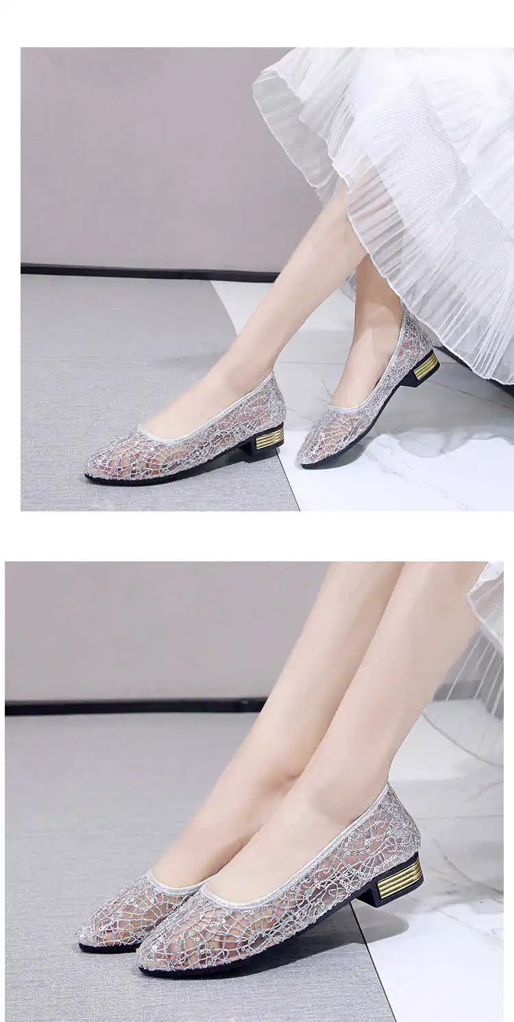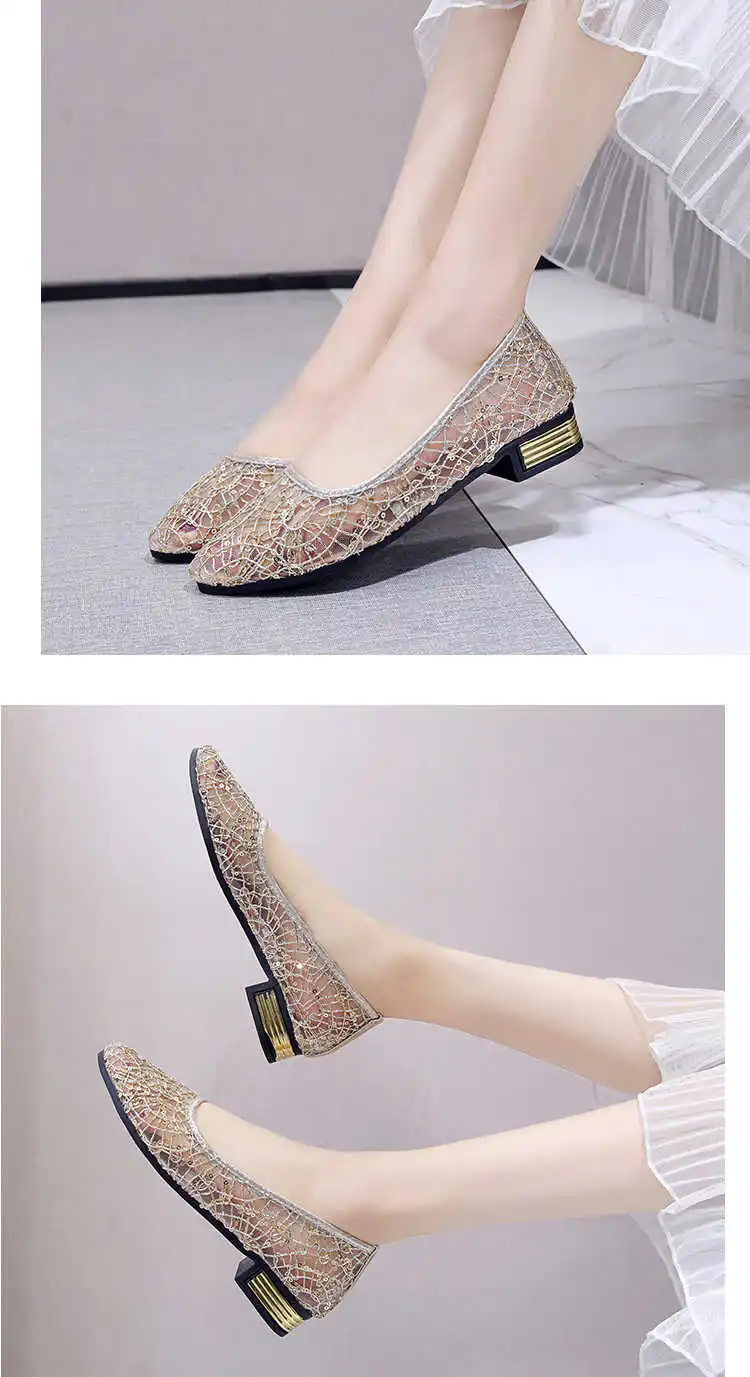 Сандалии женские, летние, новые, модные, женские сандалии, 2021, золотистые, с острым носком, на плоской подошве, дышащая, сетчатая, кружевная, удобная обувь на низком каблуке