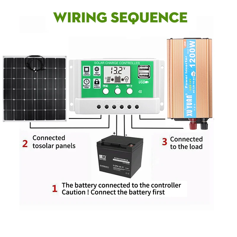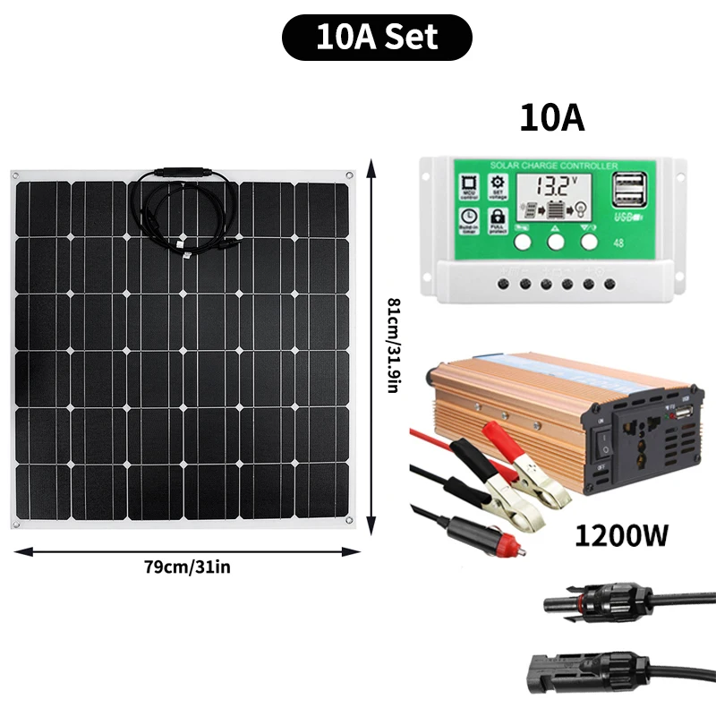 Особенности:● Гибкие солнечные панели (600 Вт)-Высокая мощность, подходит для улицы и RV-- ЭТФЭ передней панели, гибкие, светильник и прочный, светильник вес-Эффективность монокристаллических кремниевых солнечных элементов составляет 24%-26%-- 4x люверсов более удобны в установке.-Водонепроницаемый IP65 класс, подходит для использования на открытом воздухе под дождем. Светильник-Подходит для кемперов, лодок, домов, садов, сараев или ферм● Контроллер солнечной батареи (30A)1. Встроенный промышленный микрочип.2. Большой ЖК-экран с регулируемыми параметрами.3. Зарядка аккумулятора PWM.4. Встроенная защита от короткого замыкания, защита от открытого замыкания, защита от обратного соединения, защита от перегрузки.5. Двойной МОП-защита от обратного тока, низкое тепловыделение.6. Параметры системы управления регулируются.● Инвертор мощности (1200 Вт)1. Преобразуйте 12 В постоянного тока в 110 В переменного тока.2. Переключатель ВКЛ/ВЫКЛ контролирует вентилятор3. Автоматическое выключение тепла4. Дополнительная емкость от перенапряжения5. Широко используется для всех видов электрического оборудования, потребляемая мощность которого равна напряжению переменного тока 220 В, таких как мобильный телефон, ноутбук, электрический светильник, цифровая камера, видеофон, телевизор, CD-плеер, DVD, электрический вентилятор, электрические инструменты и так далее.6. Безопасная конструкция зарядки защищает ваши устройства от чрезмерного тока, перегрева, короткого замыкания и перезарядкиВстроенный вентилятор охлаждения помогает уменьшить тепло7. Корпус из алюминиевого сплава, антиоксидантный, прочный, модный и прочный8. Непосредственно Подключите к автомобильному прикуривателю или аккумулятору, удобно использовать9. Идеально подходит для использования в автомобиле для отдыха, работы и кемпинга
