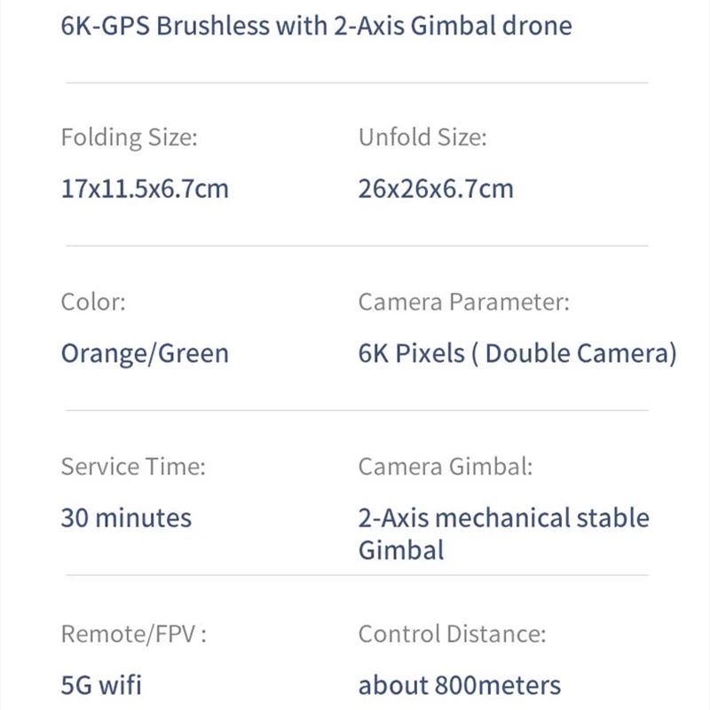 1. Профессиональная версия 6K HD, двухосевой механический самостабилизирующий карданный шарнир, стабильная съемка, четкое изображение2. Фюзеляж принимает инновационный кросс-складной и удобный складной дизайн, который чувствует себя точно3. Бесщеточный двигатель обладает сильной мощностью и сильным сопротивлением ветру4. GPS + оптический поток двойного режима, GPS интеллектуальное позиционирование и возвращение домой, лучше предотвратить потерю самолета5. 5G wi-fi высокой четкости передачи изображения, может делать фотографии/видео с жестами6. Имеет пульт дистанционного управления с выдвижным ящиком7. Модуль батареи, с дисплеем питания, 11. 1V 2850mhh литиевая батарея, около 30 минут