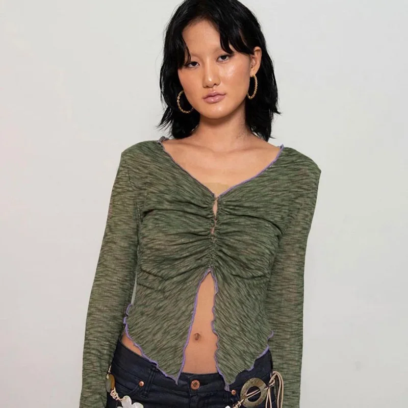 90s винтажная Фея! Кофта с рюшами и бантиком майки Y2K эстетику для женщин с v-образным вырезом и расклешенными рукавами, рюшами и разрезом кроп-топы сексуальная летняя футболка, одежда