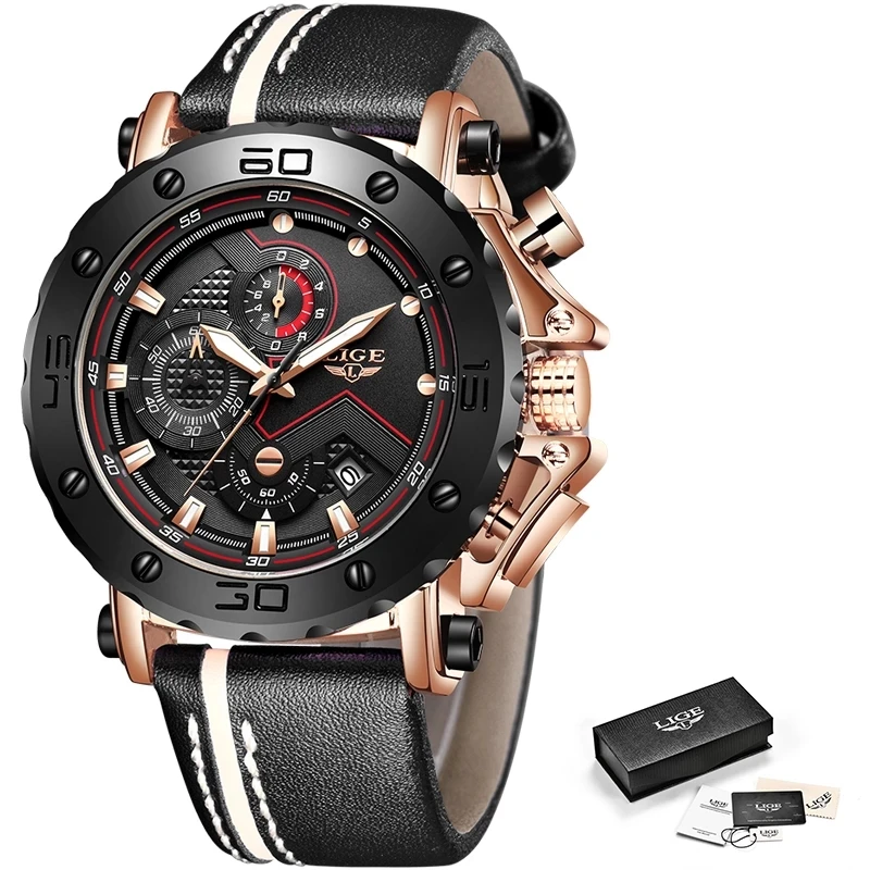 Часы наручные LIGE мужские водонепроницаемые с кожаным ремешком, сп...