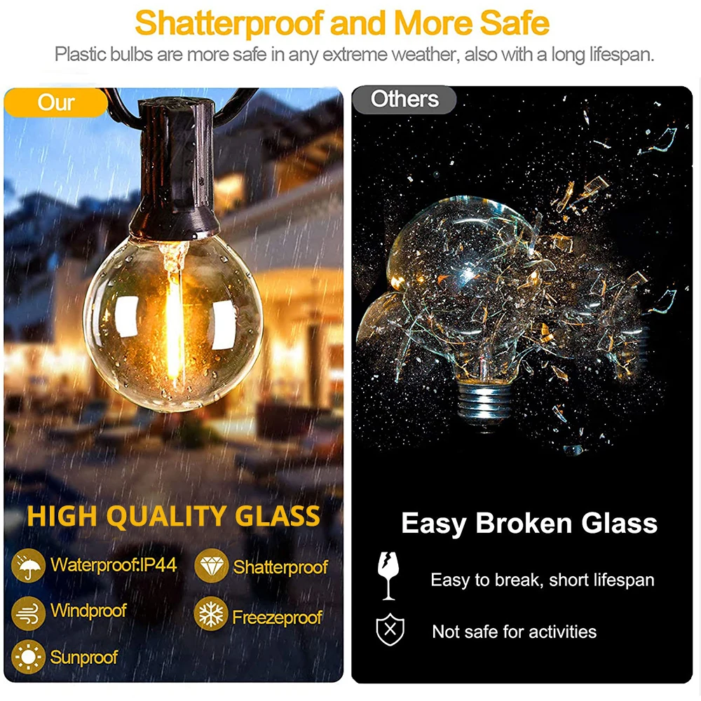 I bought some string lights before and need to be plugged in all the time. When it rains, I am worried that they will be broken. Now I have purchased solar string lights. They are charged during the day and are shining at night. They are very beautiful, and they are rainproof, so I don't have to worry about damage.