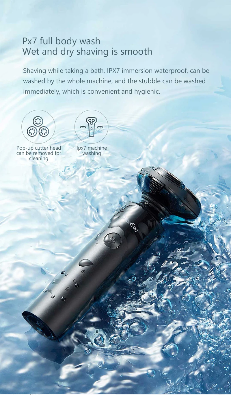 Влажное и сухое бритье гладкоеБритье во время принятия ванны, водонепроницаемость IPX7, можно мыть всей машиной,И щетину можно мыть сразу, что удобно и гигиенично.Всплывающая режущая головка может быть удалена для очисткиIpx7 машинная стирка