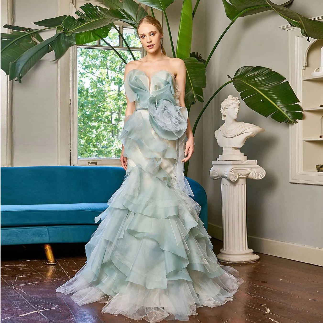 Платье-Русалка длинное из тюля, с оборками, с цветочным принтом, для выпускного вечера, со шлейфом, размера плюс