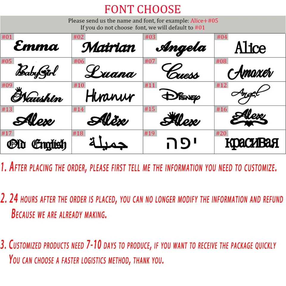Примечание: друзья, после размещения заказа, пожалуйста, пришлите нам имя, которое вы хотите настроить, а затем выберите желаемый Тип шрифта (например: Alice + #01) чтобы мы могли произвести его.