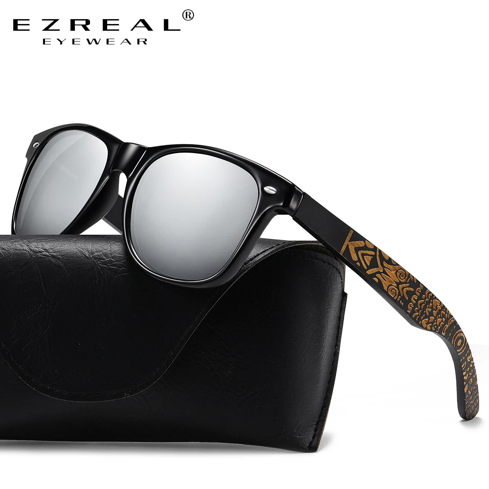 Женские и мужские темные очки EZREAL, поляризованные солнцезащитные очки с черными бамбуковыми деревянными дужками и кожаным чехлом с узором UV400