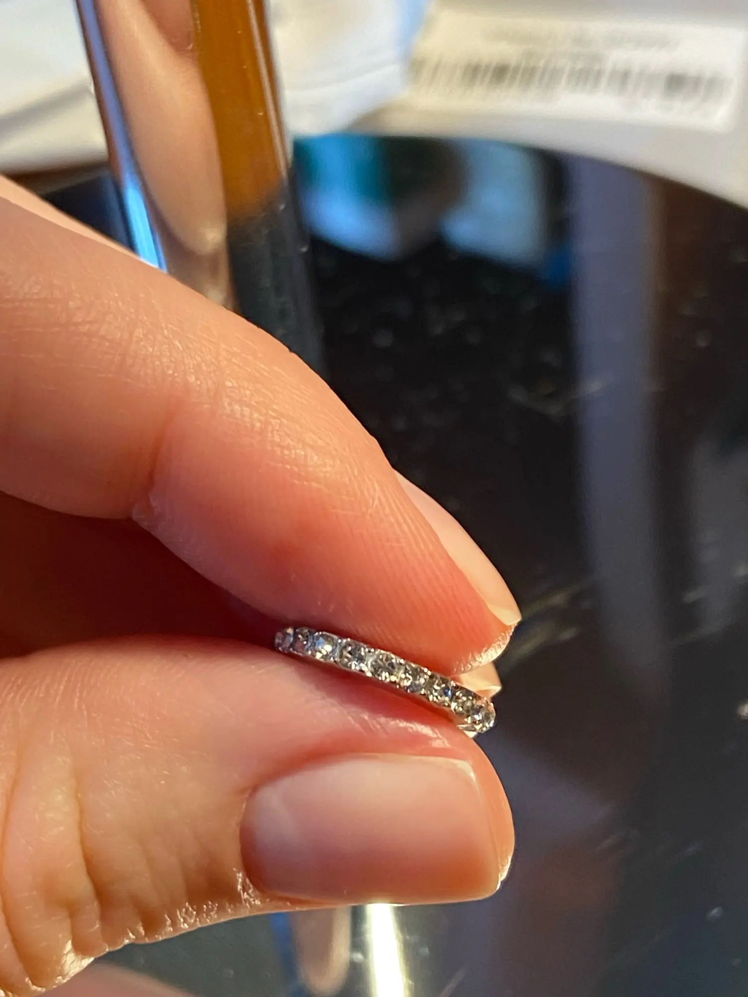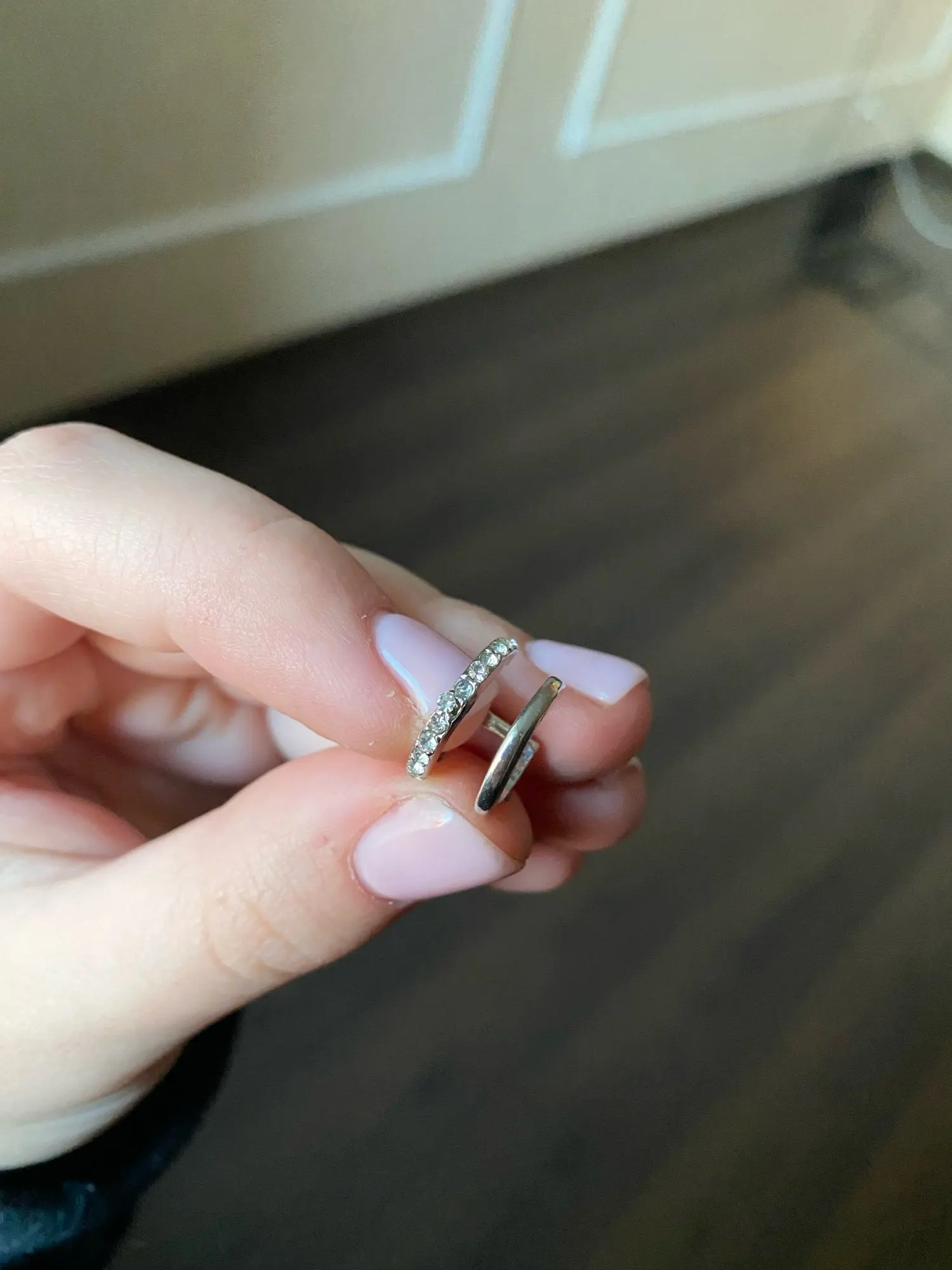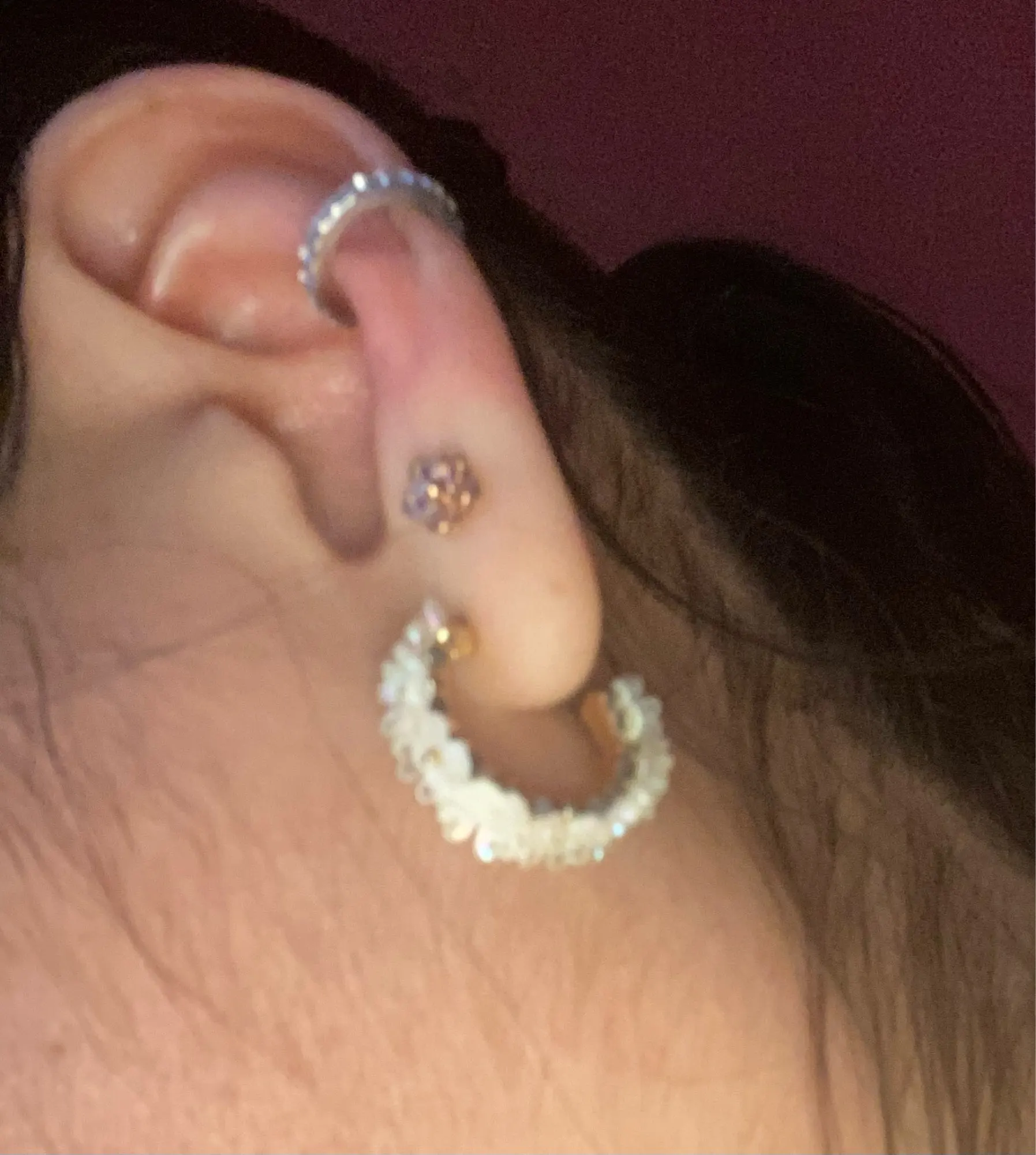 Mas pequeño que en la imagen y los hierros del pendiente mas unidos. No creo que pueda usarlo porque estan muy juntas las dos linias que unen el pendiente y me harían daño en la oreja.