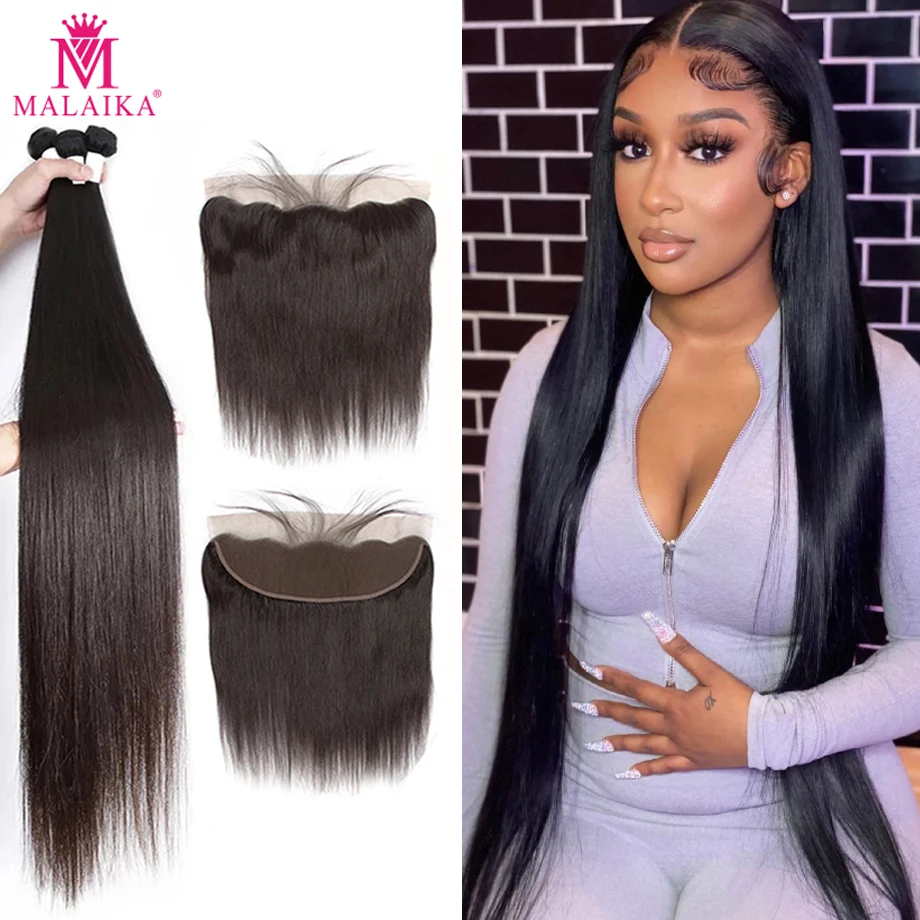 Прямые волосы Malaika, 28, 30, 40 дюймов, 3, 4 пряди с фронтальной сеткой, Бразильские Длинные волосы Remy, 100% человеческие волосы, волнистые и 13X4 кружева
