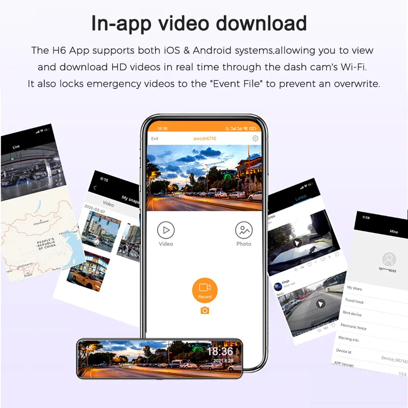 Приложение поддерживает системы iOS и Android, позволяя просматривать и загружать HD видео в режиме реального времени через Wi-Fi dash cam. Он также блокирует аварийные видео в «Файл события», чтобы предотвратить перезапись.