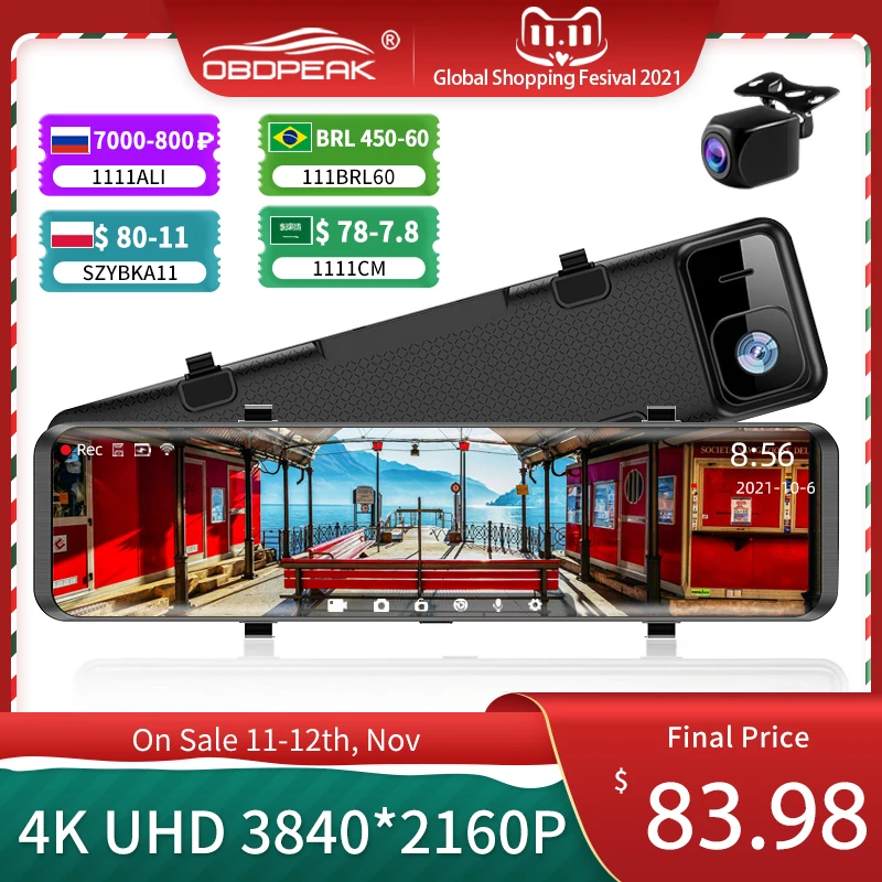 Автомобильный видеорегистратор OBDPEAK H6 IMX415 4K, рекордер, 12 дюймов, зеркало заднего вида, Dvr 3840*2160P, GPS, ночное видение, автомобильный Реверсивный видеорегистратор
