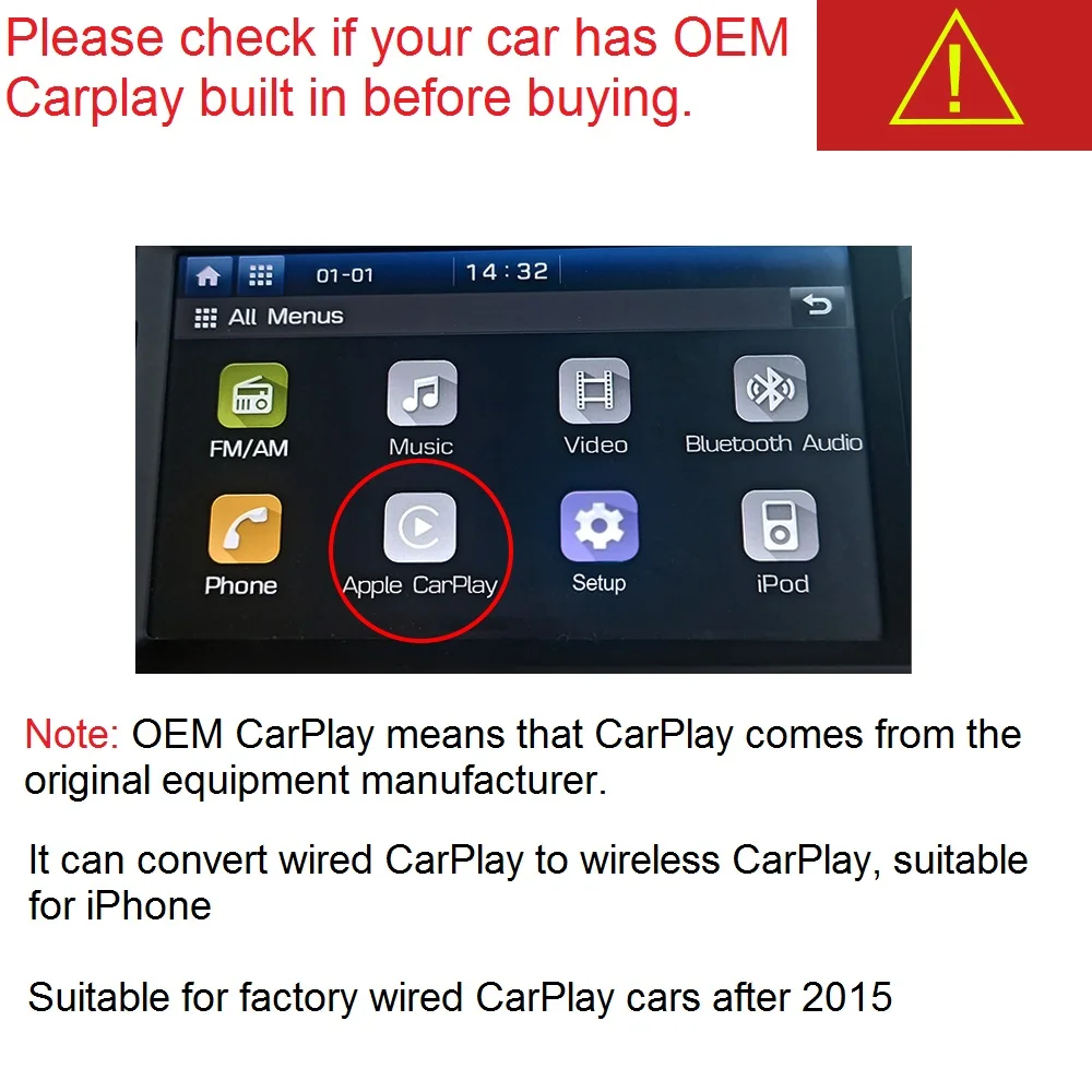 Беспроводной адаптер Apple Carplay для Benz Audi VW Skoda Mazda Toyota Honda Mitsubishi Hyundai Kia Peugeot CitroenПеред размещением заказа проверьте, является ли ваш автомобиль портом USB или портом Type C. Необходимо выбрать поддерживающий кабель для передачи данных, который будет использоваться нормальноПримечание: должны соответствовать следующим двум условиям использования продукта одновременно①Мобильный телефон: поддерживает только iPhone IOS 10 и выше②Машина автомобиля: Carplay с автомобилем (включая автомобиль Android с carplay, оригинальный автомобиль с carplay, Android auto, Apple carplay)Особенности:1. Продукт называется CarPlay беспроводной активатор/адаптер, который используется для преобразования Автомобиля OEM проводной CarPlay в беспроводной CarPlay.2. Подключи и работай: Настройка очень простая и высокая эффективность работы.3. Автоматическое подключение:1) после подключения продукта в первый раз, он автоматически подключится к беспроводной Carplay в следующий раз.2) Беспроводная CarPlay позволяет легко воспроизводить музыку, перемещаться или использовать Siri для серфинга в Интернете беспроводной ly4. Идеально подходит для коротких поездок, вы можете положить свое яблоко в карман и подключить к развлекательной системе автомобиля без использования кабеля передачи данных для его подключения5. Этот продукт является оригинальным проводным карликом для беспроводной конверсионной коробки carplay, без активатора!6. Поддерживает Автомобили со встроенными оригинальными автомобилями Android и Apple carplay7. Поддержка проводной CarPlay для изменения экрана/блока/навигатора Android (например, Sony,Alpine, Pioneer, Jndsny, Kenwood и т. д.).8. Поддержка iPhone, беспроводное Использование Apple CarPlay.9. Поддержка автомобилей с проводным оригинальным CarPlay, встроенный после 2015 года, и может конвертировать проводную CarPlay в беспроводную CarPlay.10. Автоматическая Беспроводная функция Androdi еще не поддерживается (проводное подключение доступно), Пожалуйста, разместите заказ тщательно для пользователей телефонов Android.Характеристики:Операционная система: Windows CeТип материала: пластикRAM: 4GМаксимальная Внешняя память: 32GСлот TF/Micro SD: 2Разрешение: 1080*1920Выходная мощность: 5 ВНапряжение: 5 ВИнтерфейс: Type-cВес изделия: 115 гЯзык OSD: китайский (упрощенный)Язык OSD: немецкийЯзык OSD: русскийЯзык OSD: французскийЯзык OSD: корейскийЯзык OSD: голландскийЯзык OSD: японскийЯзык OSD: испанскийЯзык OSD: английскийОсобенности 1: Проводное и беспроводноеОсобенности 2: Apple CarPlayОсобенности 3: Автомобильный мультимедийный carplayХарактеристики 4: Plug & playХарактеристики 5: оригинальный встроенный автомобильОсобенности 6: навигационная Музыкальная картаХарактеристики 7: Carplay Dongle AutoХарактеристики 8: Smart BoxХарактеристики 9: Type-cПосылка:1 * Беспроводной адаптер Apple Carplay1 * USB кабель1 * Руководство пользователяПримечание:2. Допускается погрешность в 0-1 см из-за ручного измерения. Пожалуйста, убедитесь, что вы не возражаете, прежде чем сделать ставку.