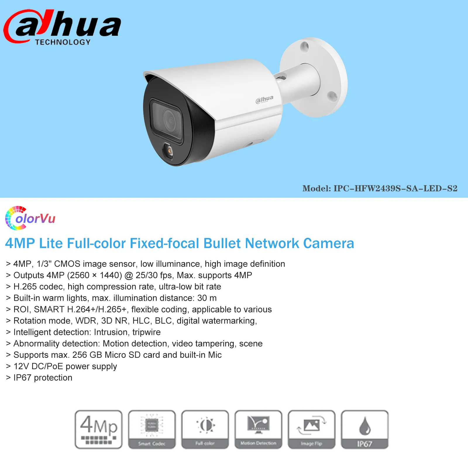 IPC-HFW2439S-SA-LED-S2Полноцветная сетевая камера с фиксированным фокусным расстоянием 4 МП Lite> 4MP, 1/3 "CMOS датчик изображения, низкое освещение, высокое разрешение изображения> Выходы 4MP (2560 × 1440) @ 25/30 fps, Макс. Поддержка 4MP> H.265 кодек, высокая степень сжатия, ультра-Низкая скорость бит> Встроенные теплые огни, Макс. Расстояние освещения: 30 м> ROI, SMART H.264 +/H.265 +, гибкое кодирование, применимое к различным> Режим вращения, WDR, 3D NR, HLC, BLC, цифровая водяная маркировка,> Интеллектуальное обнаружение: вторжение, трос> Обнаружение аномалий: обнаружение движения, подделка видео, сцена> Поддерживает макс. 256 ГБ Micro SD карты и встроенный микрофон> 12V DC/PoE источник питания> Защита IP67
