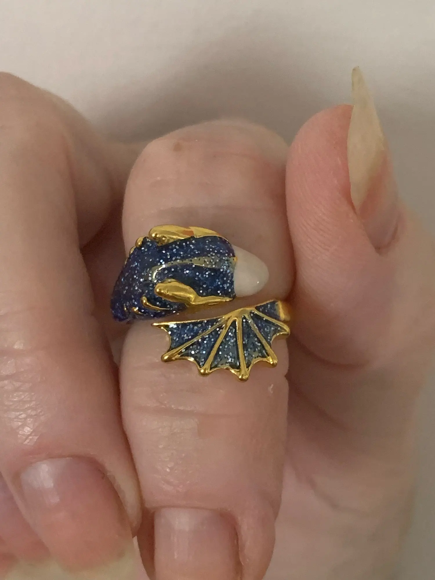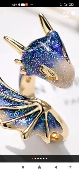 Пришло кольцо за месяц. Только на фото голова дракона далеко от крыла, а в реальности голова лежит на крыле, но это не кретично. Очень красиво выглядит- ребенку понравилось, и по размеру подошло.
