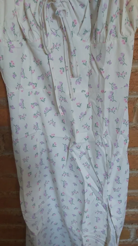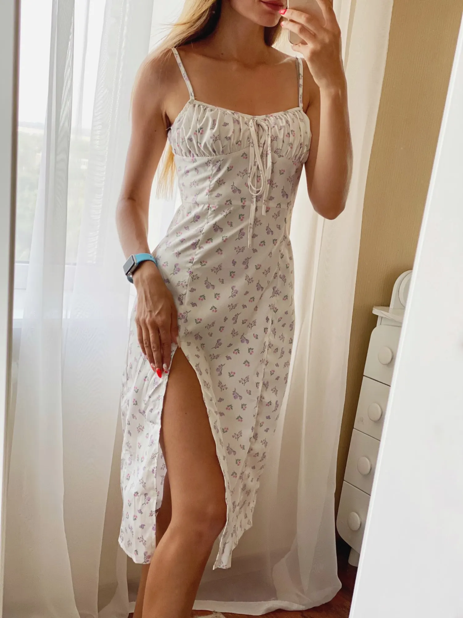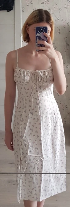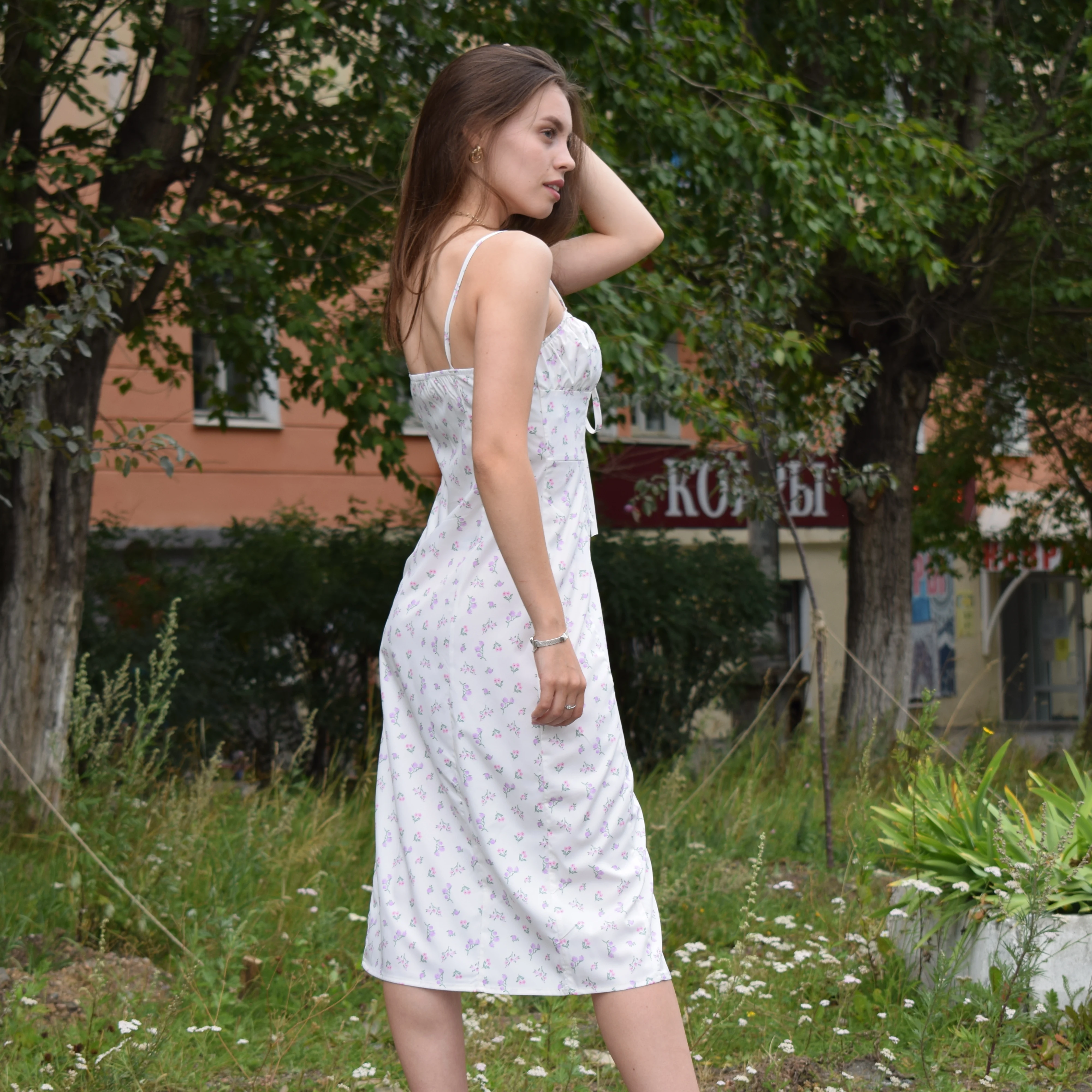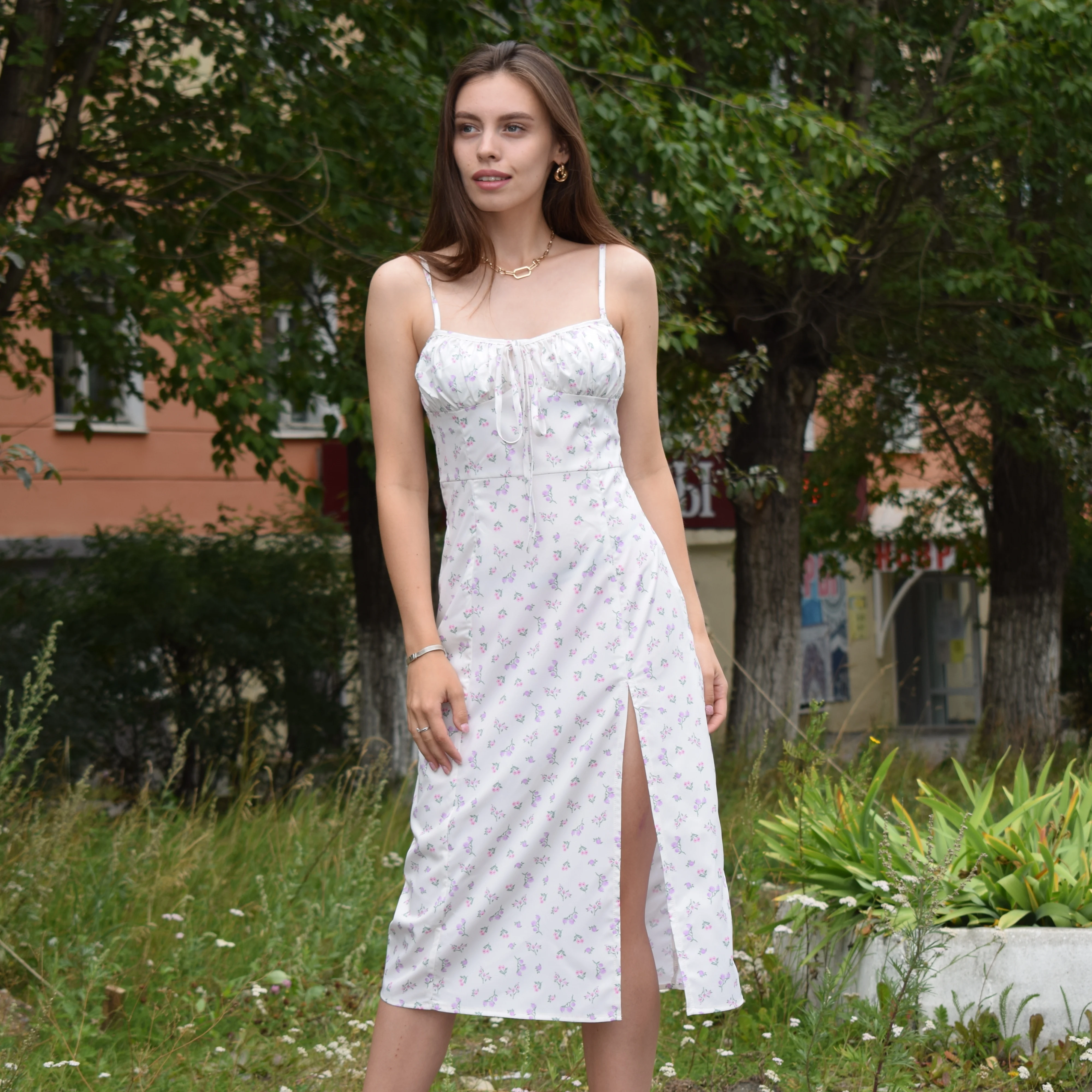 Легкое элегантное платье во Французском романтическом стиле на тонких бретельках молочного цвета в мелкий цветочек.Спереди на груди шнуровка, завязывается на бантик. Сбоку есть потайной замочек. Разрез на левой ножке смотрится кокетливо. Сшито платье из спандекса и полиэстера, но приятное к телу. Такой материал очень легко гладить. Идеальный вариант на жаркое лето. Ткань качественная, не просвечивает. Все швы ровные, нет торчащих ниток. На свой рост 1 73 с параметрами 90-58-88 брала размер М. Платье оказалось свободным. В следующий раз закажу размер S,люблю когда платье облегает фигуру. Посылка отслеживалась и пришла до Новосибирска через две недели без постороннего запаха. . Всегда заказываю одежду у данного продавца. Всем рекомендую к покупке.