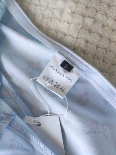 Красивое платье из лёгкого и очень приятного к телу материала . Цвет небесно голубой с лиловыми цветочками . Материал тянется ,но не сильно. Ткань синтетика ,но очень приятной фактуры . В платье не жарко. Хорошо продувается. Не просвечивает. Посылка пришла без запаха. Гладить просто. Швы все ровные, нитки не торчат. Качество очень высокое. К покупке рекомендую !В Новосибирск прилетело очень быстро. Продавец общительный ,помог с выбором размера . На мои параметры размер S сел свободно, я люблю когда больше в обтяг. Грудь 83 Под грудью 72 Бедра 88 Вес 50