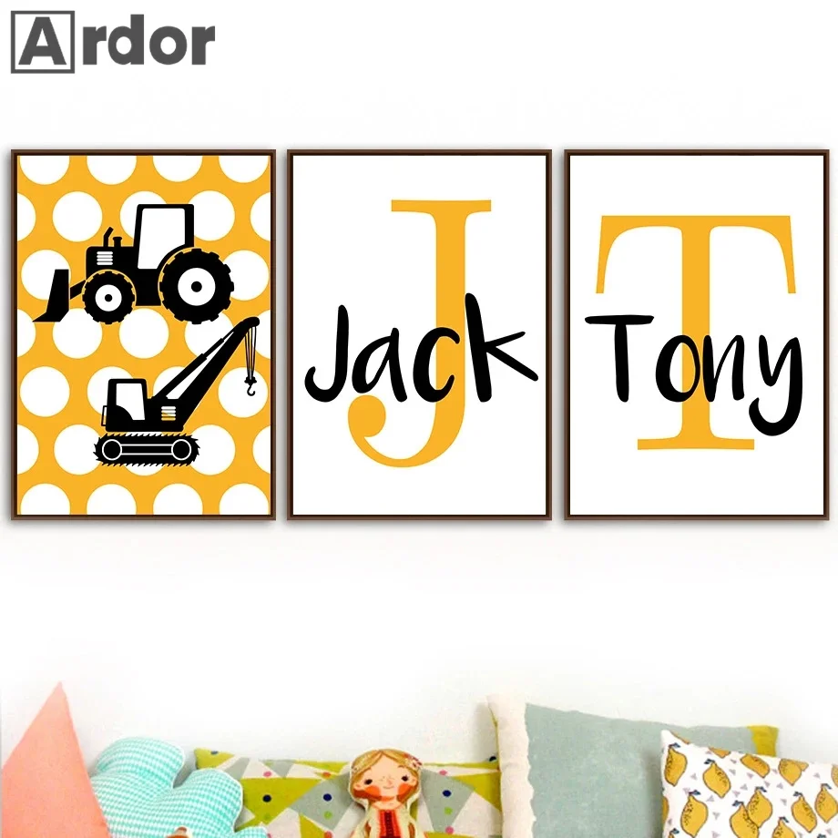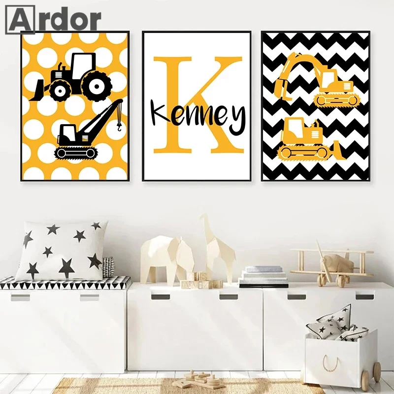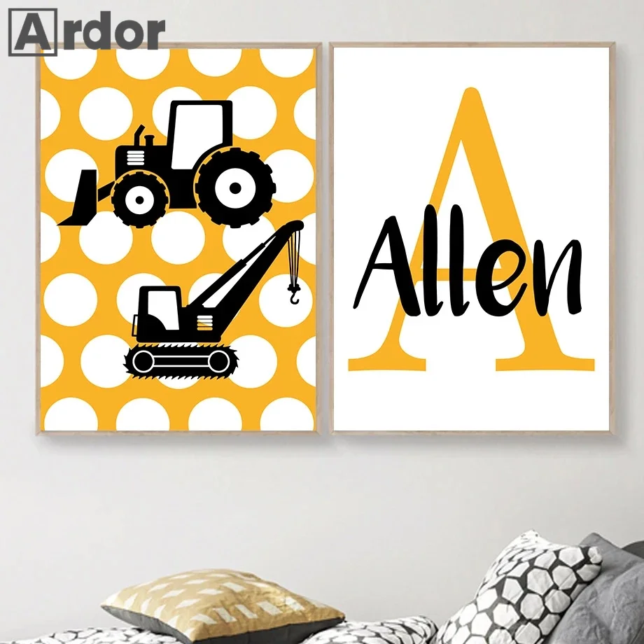 Настенный плакат с именем на заказ, Картина на холсте с экскаватором журавлем, черная, желтая линия, Скандинавская картина, декор для детской комнаты