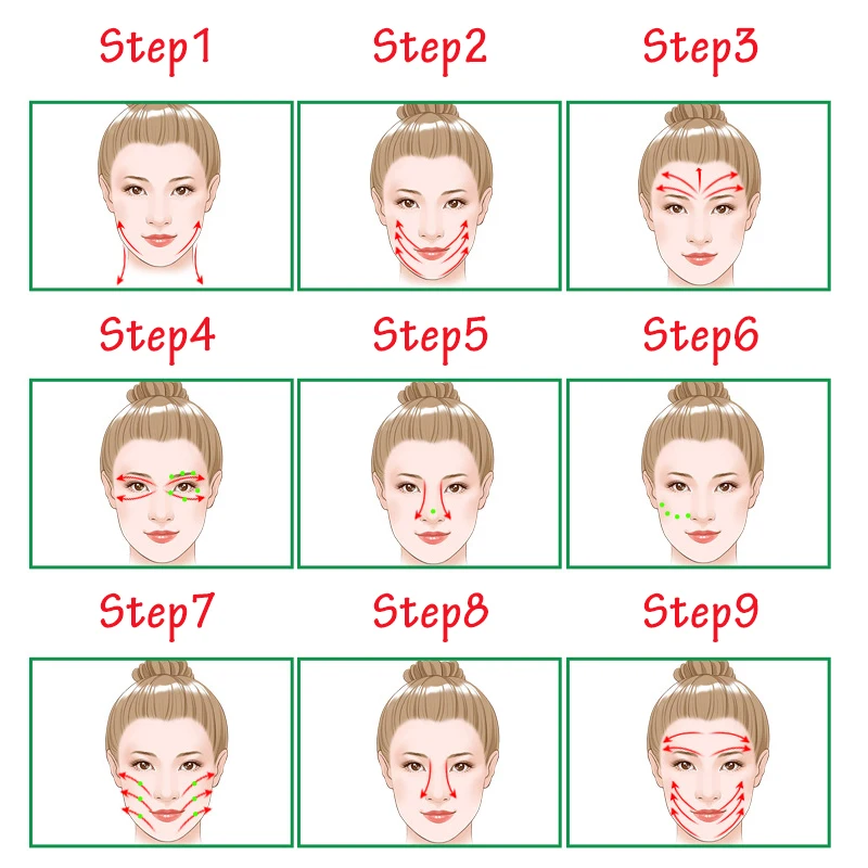 1. Снимает напряжение лица2. Улучшает эластичность кожи, подтягивая и тонизируя кожу3. Препятствует появлению тонких линий и морщин4. Уменьшает отечность, мешки для глаз и темные круги вокруг глаз5. Помогает проникнуть в косметику, как кремы для лица и сыворотки глубже в кожу для лучшего поглощения6. Способствует циркуляции крови к лицу для естественного здорового свечения