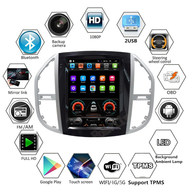 11. Поддержка входа камеры заднего видаАвтомобильная Видеосистема, поддерживающая резервную камеру, отображает Проблемные точки на мониторе, позволяя водителю видеть опасности, такие как домашние животные, детские игры или почтовые ящики, по мере их резервного копирования.Автомобильное радио для Mercdes Benz Vito