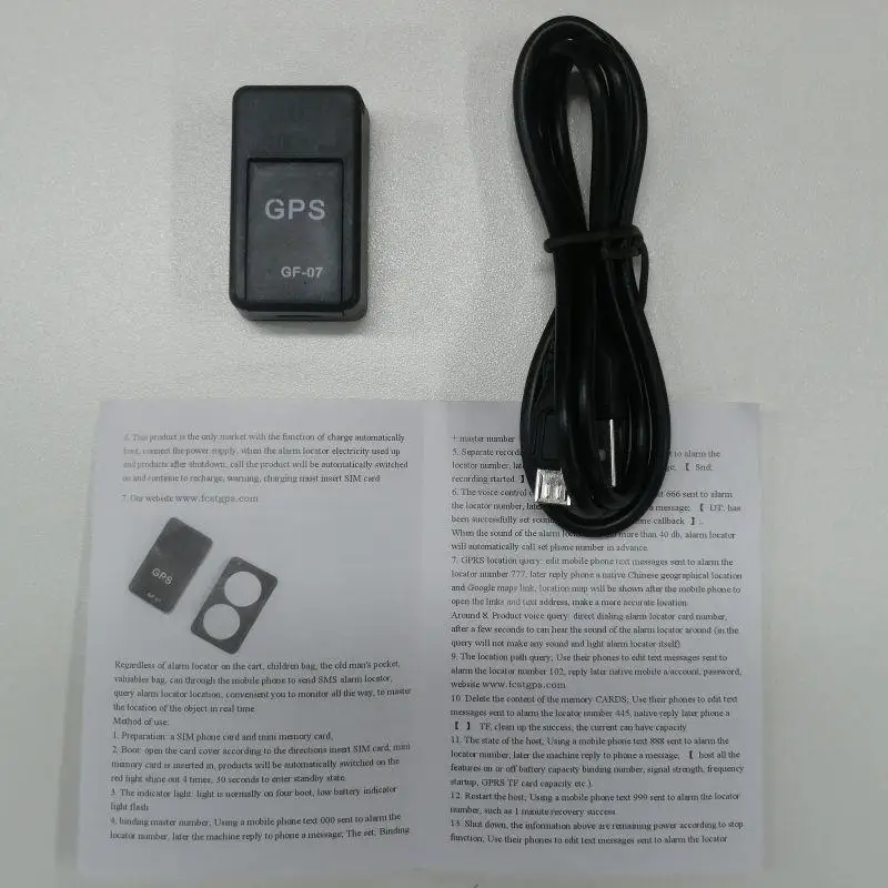 Способ использования:1. Подготовка: sim-карта телефона и мини-карта памяти.2. Загрузка: Откройте крышку карты в соответствии с инструкциями вставьте sim-карту, мини-карту памяти вставляется, продукты будут автоматически включаться красный светильник высветится 4 раза, 30 секунд для входа в режим ожидания.3. Светильник индикатора: светильник обычно находится на четырех зарядках, индикатор низкого заряда батареи-светильник.4. Основной номер привязки: используйте мобильный телефон, текст 000, отправленный для сигнализации номера локатора, позже машина ответит на сообщение телефона; Набор: привязка + Главный номер.5. Отдельные записи: используйте мобильный телефон с текстом 55, отправленным для сигнализации номера локатора, позже машина ответит на сообщение.[Snd: запись начинается]6. Голосовое управление обратным звонком: с помощью mobiel phone text 666 отправляется для сигнализации номера локатора, позже машина ответит на телефонный сообщение.[DT: был успешно установлен Звуковой Монитор, сигнал тревоги телефонного звонка], когда звук локатора сигнализации около 40 дБ, локатор сигнализации будет автоматически устанавливать номер телефона заранее.7.GPRS запрос о местоположении: отредактируйте мобильный телефон текстовые сообщения, отправленные для сигнализации номер локатора 777, позже ответьте на телефон с родным географическим местоположением и Google maps lik, карта местоположения будет показана после того, как мобильный телефон откроет ссылки и текстовый адрес, сделает более точное местоположение.8. Голосовой запрос продукта: карта локатора с прямым набором номера, через несколько секунд вы услышите звук локатора larm (в запросе не будет издавать звуковой сигнал и светильник).9. Запрос пути местоположения: Используйте свои телефоны для редактирования текстовых сообщений, отправленных для сигнализации номера локатора 102, ответьте позже на мобильный телефон a/account, пароль, веб-сайт www.fcstgps.com.10. Удалите содержимое карт памяти: Используйте свои телефоны, чтобы отредактировать текстовые сообщения, отправленные для сигнализации номера локатора 445, ответ на мобильный телефон a [ ]TF, очистите успех, ток может иметь емкость.11. Состояние хоста: с помощью mobiel phone text 888 отправлен сигнал с номером локатора, позже машина ответит на телефонный сообщение. [Поддерживает все функции включения или выключения номера привязки емкости аккумулятора, силу сигнала, запуск частоты, емкость карты TF GPRS и т. Д.]12. Перезагрузите хост: используйте мобильный телефон с текстом 999, отправленным для сигнализации номера локатора, например, 1 минута успеха восстановления.13. Отключение, информация выше оставшаяся мощность в соответствии с функцией остановки: Используйте свои телефоны для редактирования текстовых сообщений, отправленных для сигнализации локатор номер 444, родной ответ позже мобильных телефонов и «Сброс: все задачи отменены ".14. Запрос электроэнергии: расположен в каждый раз, когда вы отвечаете.