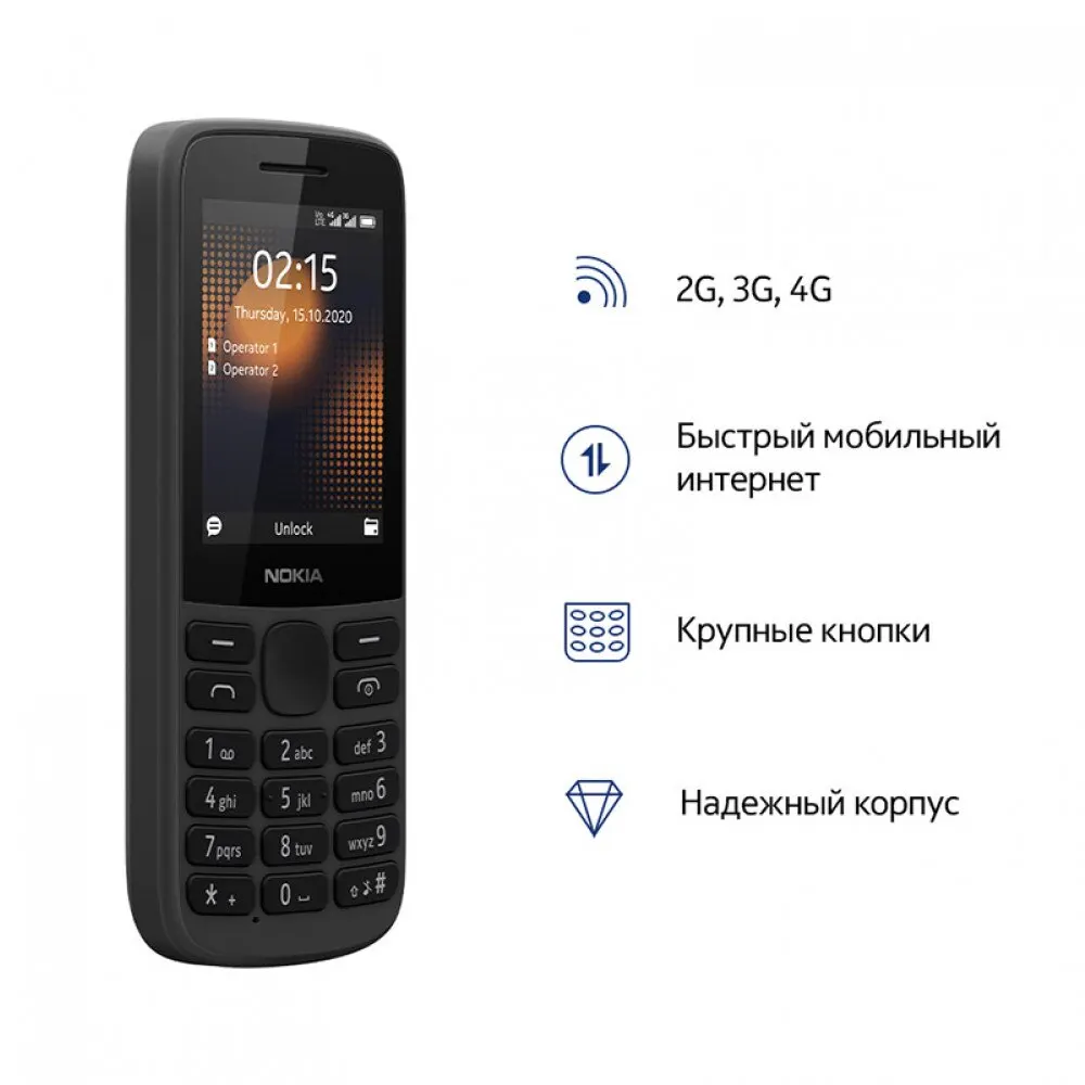 Nokia 215 4GNokia 215 4G — знакомый телефон стал еще лучше. Благодаря подключению к сети 4G доступна передача голоса высокой четкости. Фирменное качество Nokia и бесконечный заряд батареи — ваш телефон прослужит долго. Общайтесь в Facebook, играйте в «Змейку» и пробные версии других игр. Предусмотрено все, что нужно для комфортного использования: крупные кнопки с мягким покрытием Soft Touch и удобный закругленный корпус. Привычный телефон с современными функциями.Технологии 4G для игр и общения в соцсетяхПередача голоса высокой четкости в сети VoLTE*, доступ к интернету и возможность пользоваться Facebook при подключении к сети 4G. Знакомый телефон обрел новые возможности — без переплаты.Емкая батарея и устойчивый к царапинам корпусNokia 215 4G — надежный помощник в повседневных делах. Фирменная надежность и бесконечный заряд батареи.