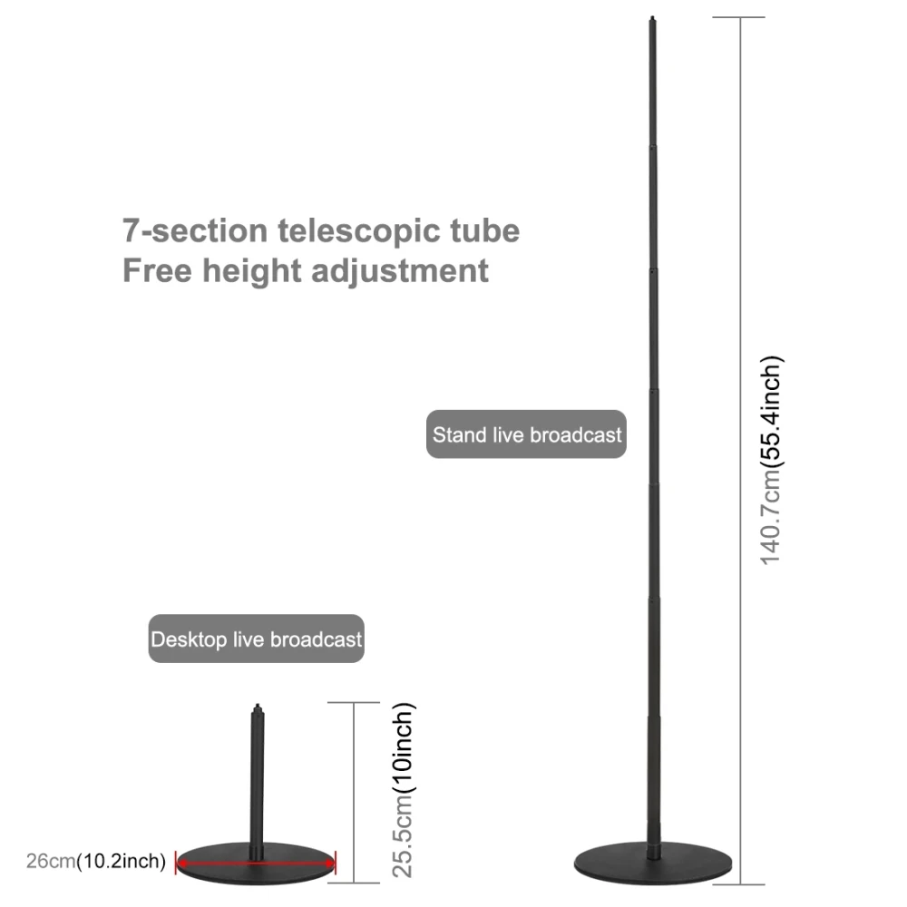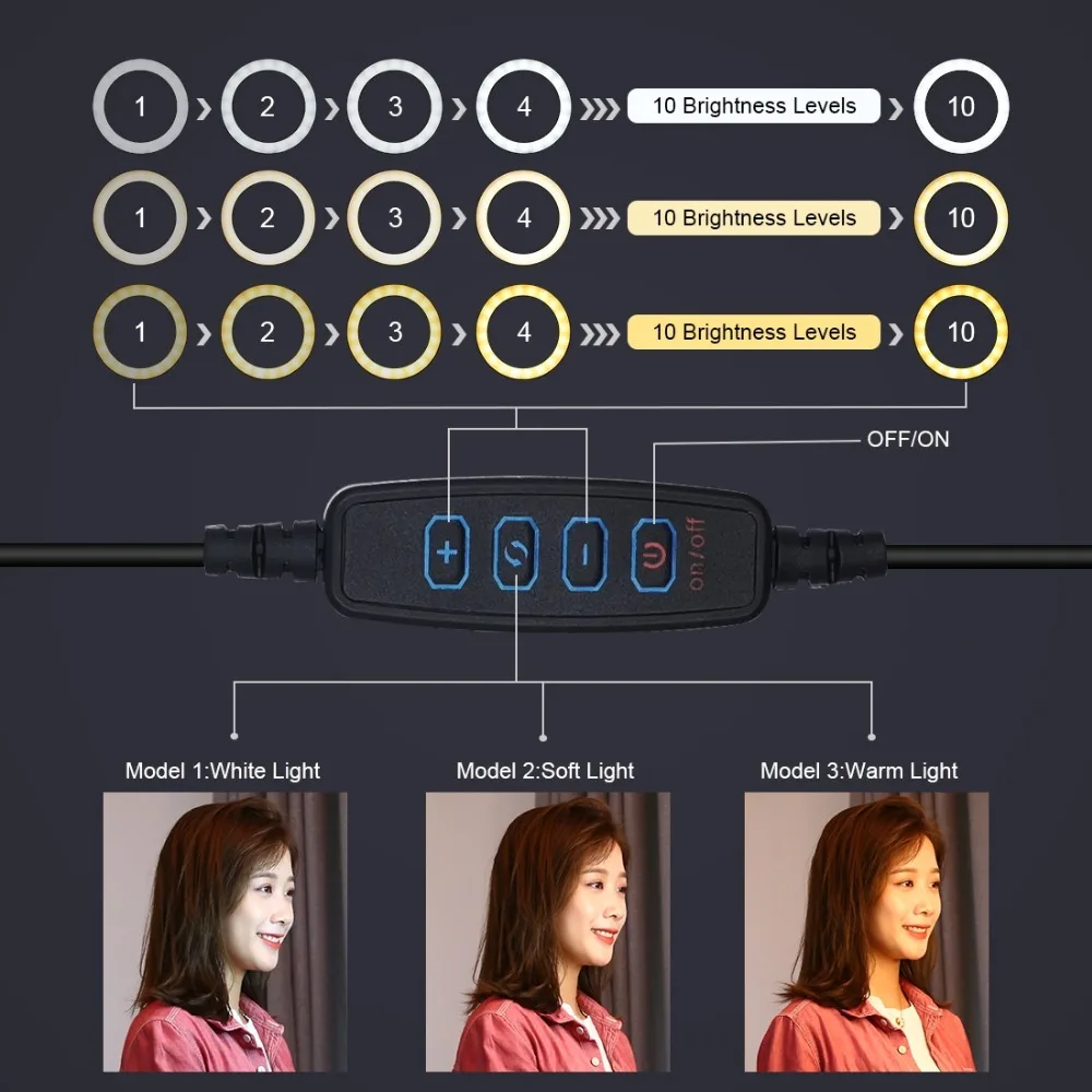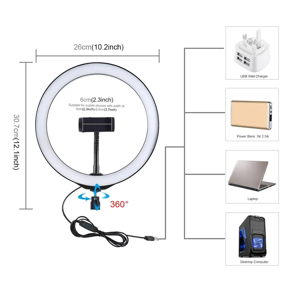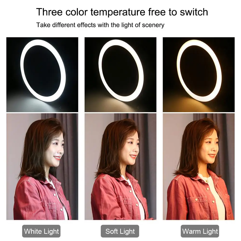 Кольцевой светодиодный светильник1. Светодиодный кольцевой светильник можно установить на держатель и взять его в любом месте, его также можно снять с подставки в любое время, шаровая Головка штатива может вращаться на 360 градусов, можно свободно регулировать под любым углом (держатель не входит в комплект).2. Кольцевой Светильник изготовлен из 80 шт. энергосберегающий светодиодный бусины, рассеивания тепла отличное постоянное потребление тока и высокий индекс цветопередачи, смягчить светильник источник и улучшить кожу тон в портреты фотографии.4. 3 цвета режима освещения Регулируемая яркость на ваш выбор, вы можете настроить цвет и яркость очень легко, идеальная яркость может быть достигнута без установки дополнительных красочных фильтров. Три цвета из мягкого натурального светильник освещения вашу красоту и в других случаях.5. Usb-порты можно использовать с несколькими устройствами, такими как подключение хоста компьютера, ноутбука, мобильного питания и USB зарядного устройства. Вы сможете наслаждаться светодиодный светильник кольцо в любое время бесплатно.6. Легкий и портативный дизайн: удобно использовать и носить с собой во время путешествий или работы на открытом воздухе и т. Д.7. Зажим для телефона подходит для мобильного телефона шириной 5,7-9 см.8. Широкое Применение: Широко применяется при естественном освещении под обстановку вне светильник, светильник портретной съемке, на модных показах, рекламная фотосъемка, съемка видео и т. д.9. Когда светодиодный кольцевой светильник включен, нажмите и удерживайте кнопку ВКЛ/ВЫКЛ, пока индикатор не начнет мигать. В это время введите режим задержки выключения, задержите одну минуту.Характеристики кольцевого светодиодный1. Количество бусин: 80 шт.2. Модель лампы: 28353. Яркость лампы: 24-26лм4. Белый светильник, цветовая температура: 6500K5. Теплая белая цветовая температура: 3200K6. Мощность: 0,1 Вт-10 Вт7. Напряжение: 5 В8. Указывает: Ra>909. Диапазон затемнения: 1%-100%10. Материал корпуса: ABS, акриловый светильник11. Размеры: Наружный диаметр 260 мм. Внутренний диаметр 210 мм12. Источник питания: порт USB13. Длина кабеля: 2 мНастольное крепление1. Выдвижной гриф-Рама, регулировка высоты мин. 25,5 см до 140,7 см.2. Регулируемый Настольный мини настольный светильник, светодиодный светильник, Настольный светильник для макияжа.3. Элегантный и стильный дизайн, прочный, легкий, портативный.4. Легко носить и устанавливать; Круглое основание, более стабильное.5. Стандартный резьбовой винт 1/4 дюйма, можно подключить к стабилизатору карданного шарнира, адаптеру головки штатива.Список посылка1. Светодиодный кольцевой видеосветильник x 12. Шаровая Головка штатива для холодной обуви x 13. Настольное крепление x 14. Зажим для телефона x 15.Сумка для храненияX 1