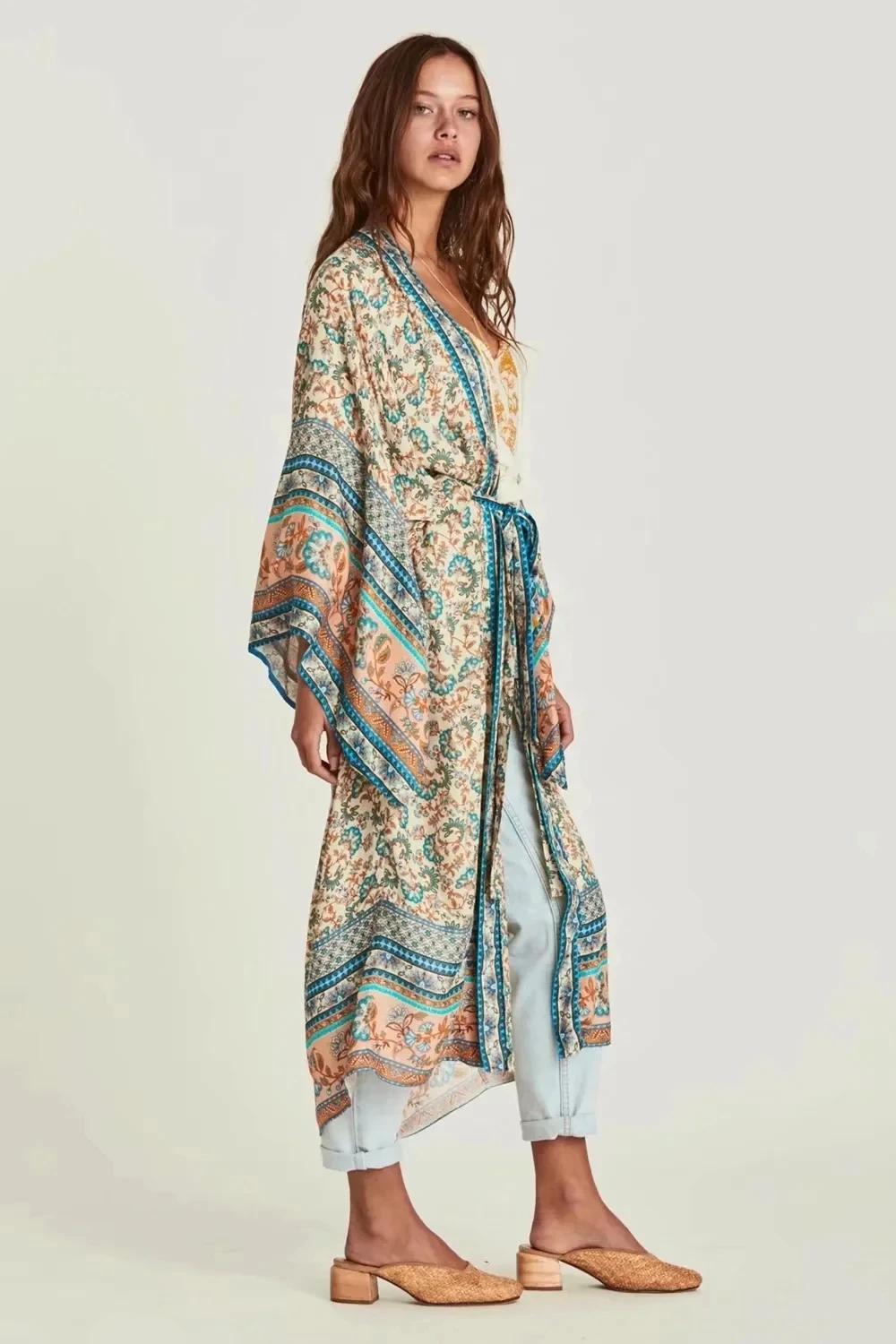 Женское винтажное богемное кимоно с цветочным принтом и рукавами ле...