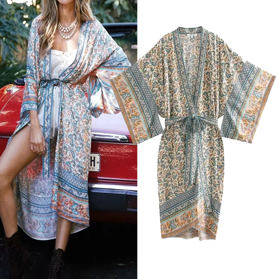 Платье-кимоно женское с цветочным принтом, Пляжное богемное с рукав...